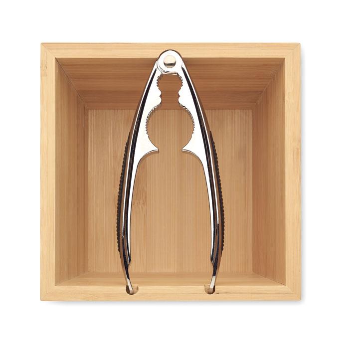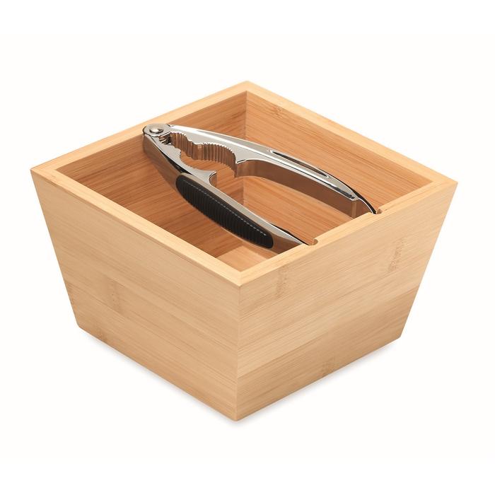 Set de casse-noix avec boite en bambou et casse-noix de couleur argentée en alliage de zinc avec poignée en TPR. Le bambou est un produit naturel, et présente de légères variations de couleur, de décoration et de tailles.