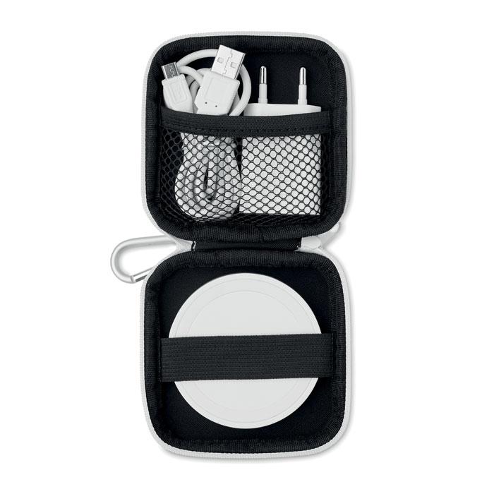 Set chargeur sans fil en ABS. Présenté dans une pochette EVA / PU. Contient une prise européenne et un câble de charge USB A vers Micro B. Données de sortie: DC5V / 1.0A.