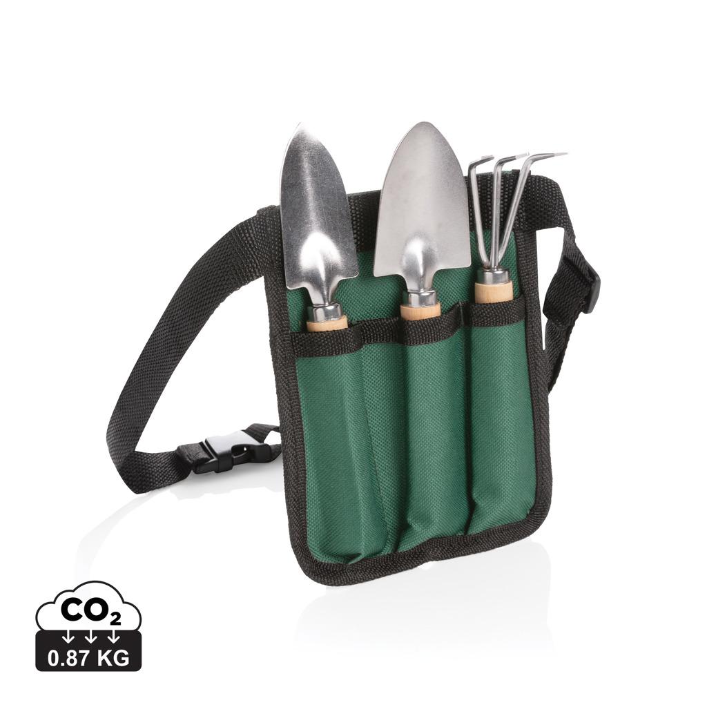 Ensemble jardinage de 3 pièces en bois comprenant un transplantoir, un petit transplantoir et un râteau. Ceinture avec clip réglable jusqu'à 120 cm et pochette en polyester pour ranger les outils.