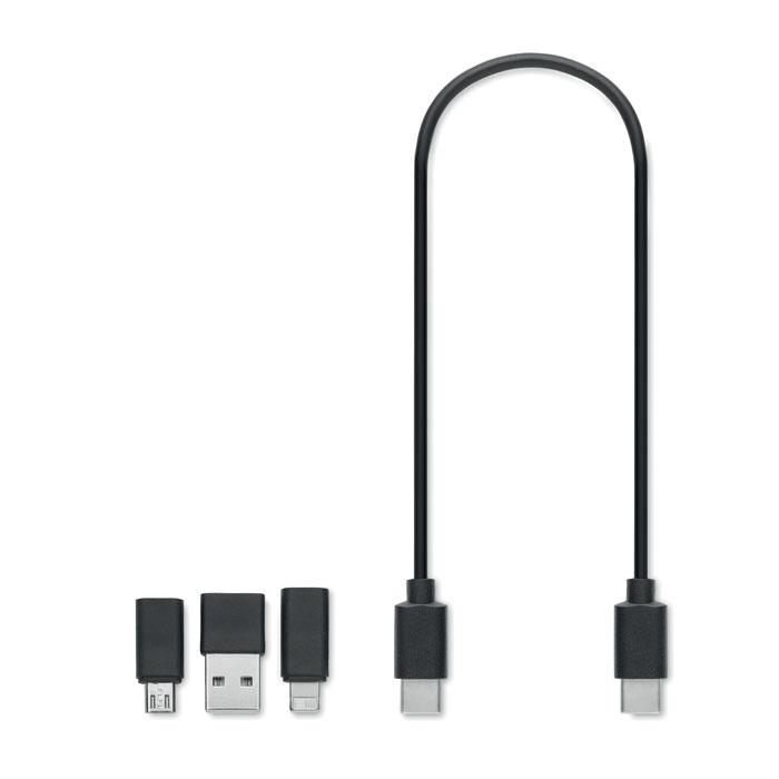 Câble de chargement 3 en 1 avec différents connecteurs. Présenté dans une boîte en bois d'acacia. Câble Type-C vers Type C, C vers USB-A, C vers micro-B, C vers connecteurs.