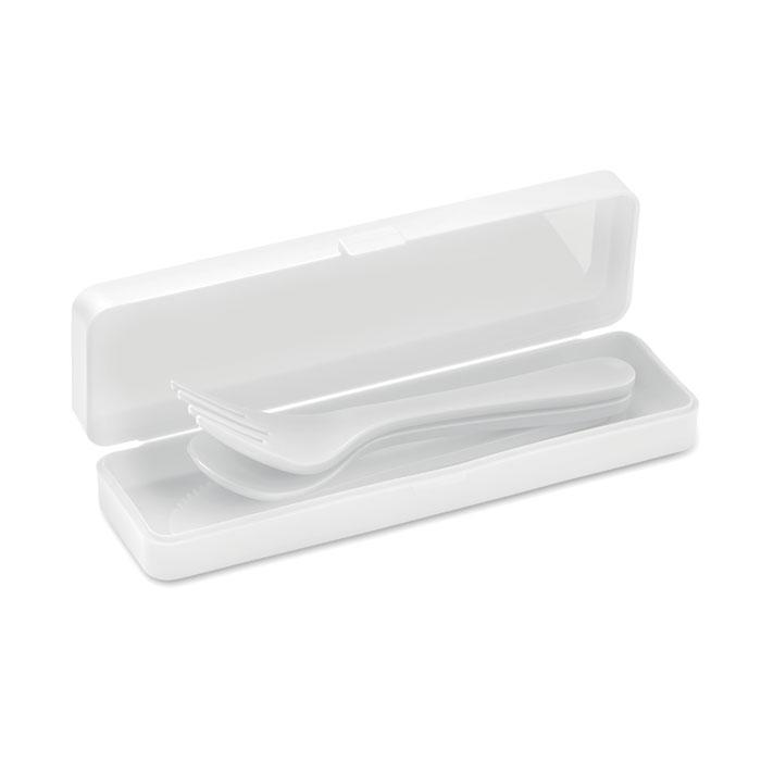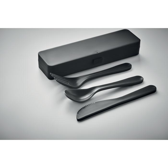 Set de couverts portable réutilisable en PP et étui. Comprend une cuillère, une fourchette et un couteau.
