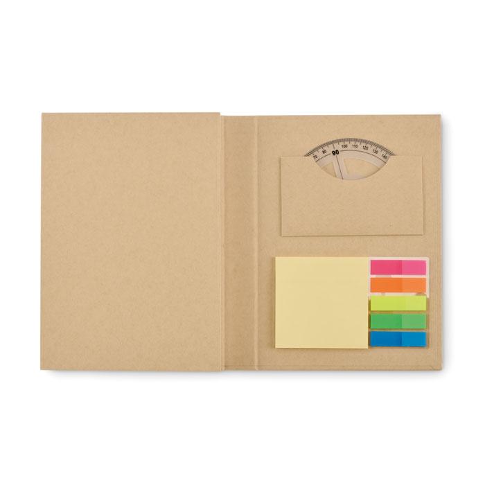 Set de bureau avec couverture en carton recyclé. Comprend 1 bloc de 70 feuilles lignées recyclées. 1 Bloc-notes adhésifs et marqueurs de page. Stylo à bille avec corps en papier et détails en ABS, taille-crayon en ABS, 2 crayons en bois, gomme, règle en bois de 15 cm et rapporteur en PP.