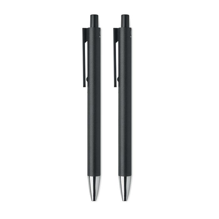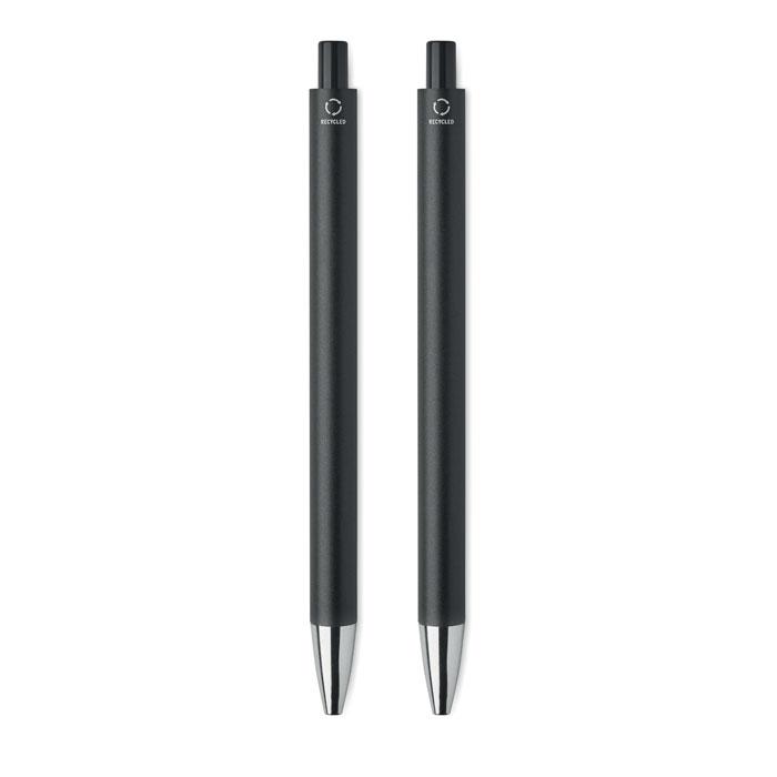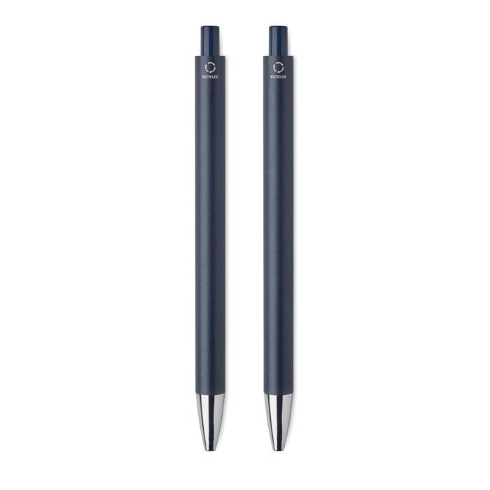 Parure de stylos en aluminium recyclé comprenant 1 stylo bille à poussoir (encre bleue) et 1 stylo graphite sans encre. Présentée dans une boîte en papier recyclé.