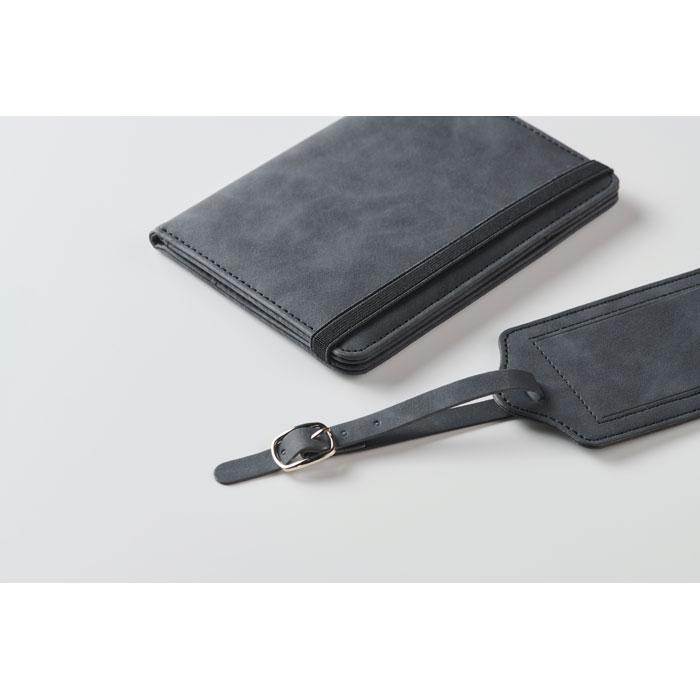 Set de protège passeport et d'étiquette de bagage en PU. Présenté dans une boîte cadeau.