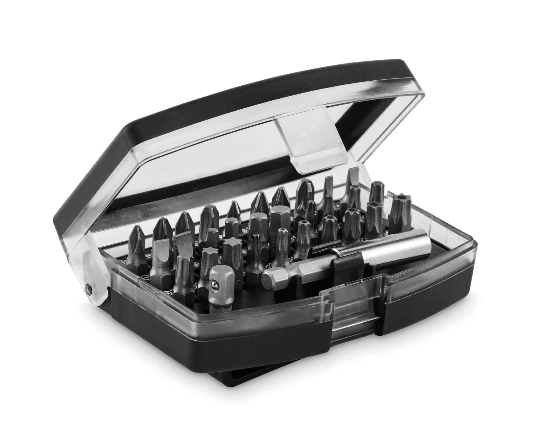 Jeu d'embouts de tournevis de 32 pièces avec porte-clips rotatif.
