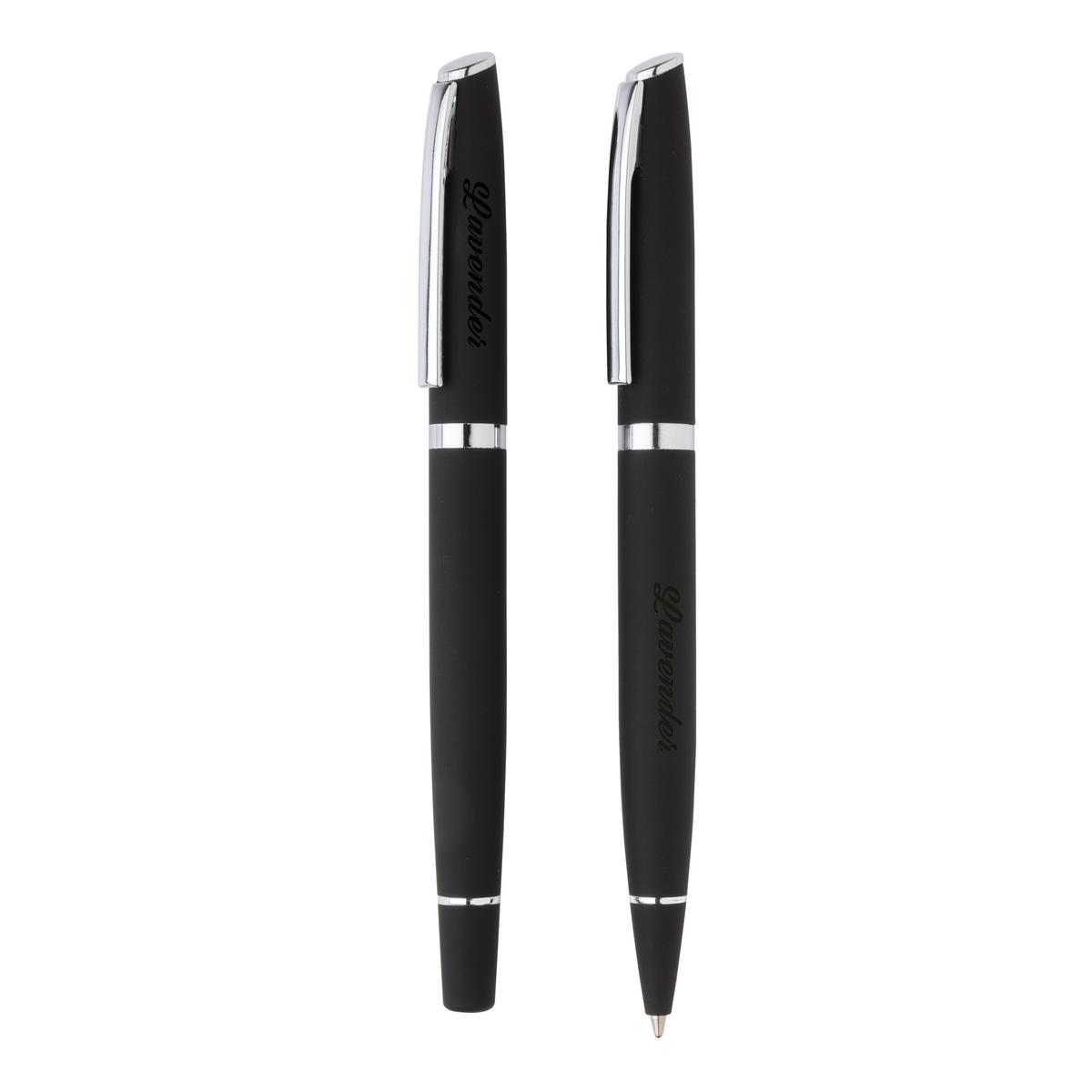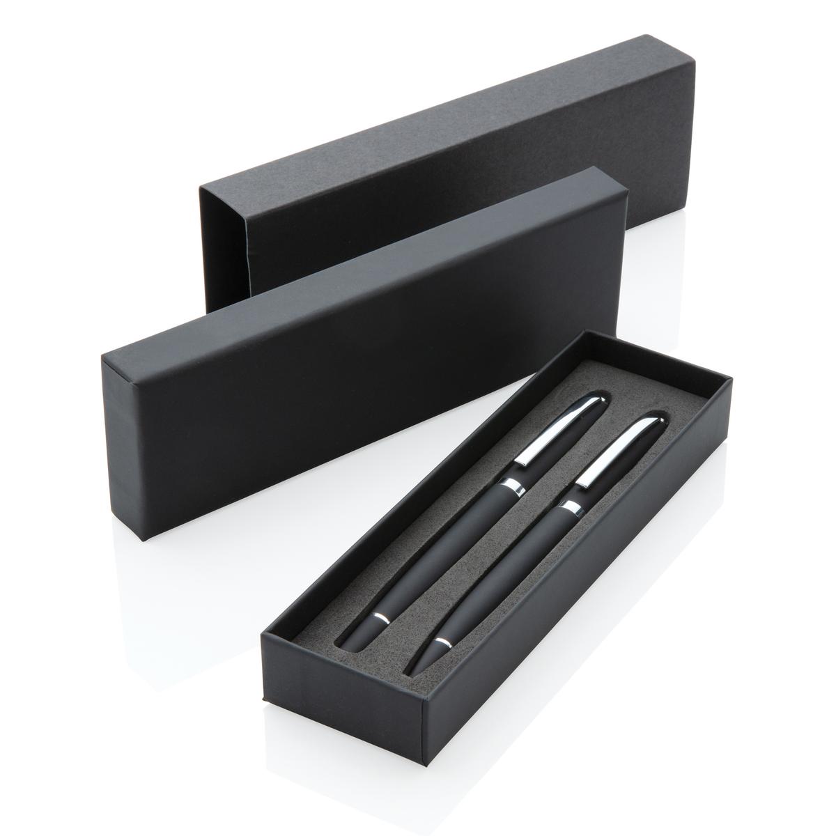 Set de stylos avec un roller et stylo à bille au design simple mais élégant. Encre bleue Dokumental® de fabrication allemande pour +/- 1200m d’écriture pour le stylo, +/- 400m pour le roller, et bille en carbure de tungstène assurant une écriture régulière. Livré dans une boite cadeau.