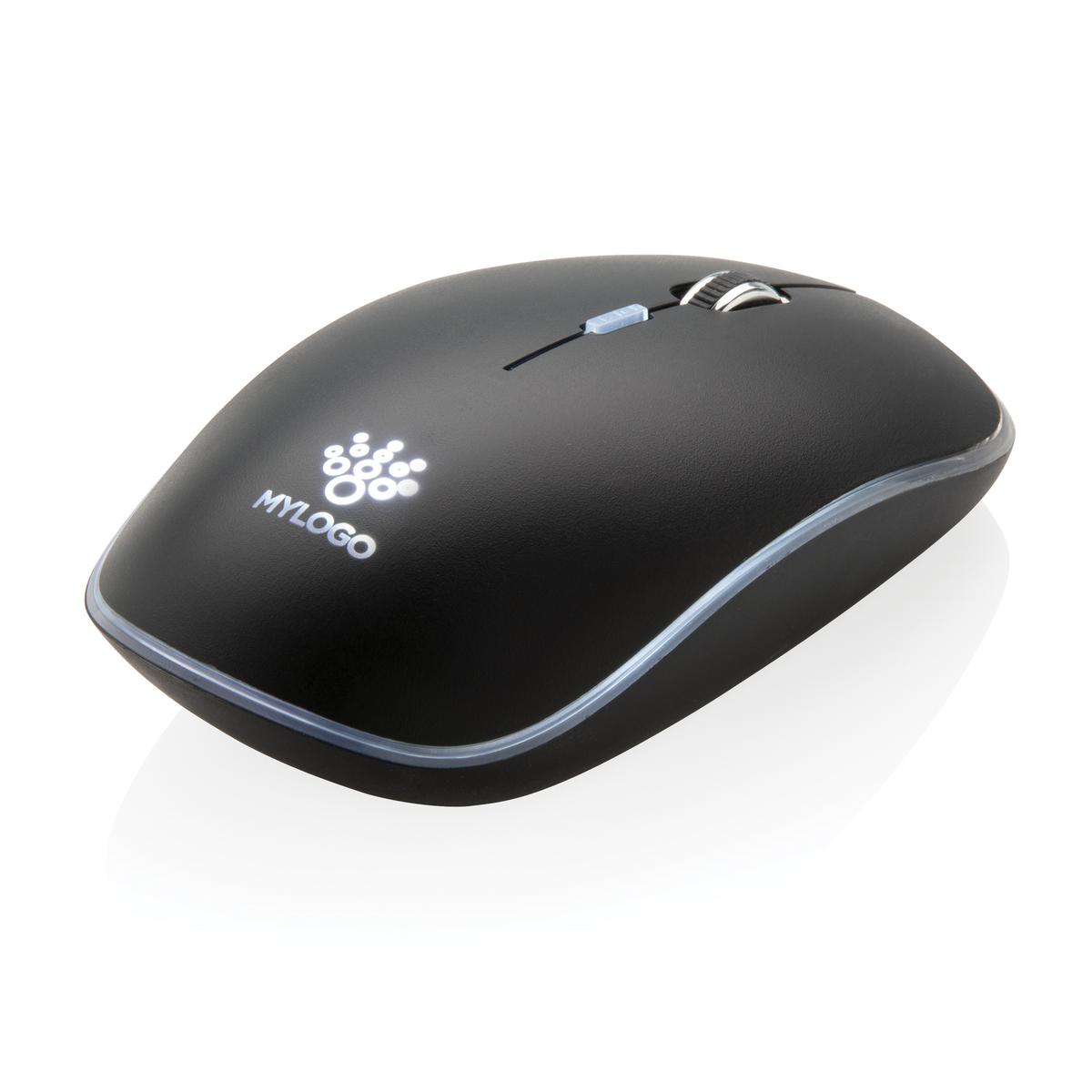Souris sans fil qui offre la possibilité de graver votre logo pour exposition optimale en l’illuminant. Batterie de 300 mAh qui peut être rechargée en trois heures. La vitesse de connexion est de 125 HZ via la clé USB incluse et facile à installer. Avec bouton de clic gauche et droit et bouton de défilement/clic central. La sensibilité de la souris peut être facilement ajustée selon vos préférences personnelles. Compatible avec tous les systèmes d'exploitation Windows et Mac récents.