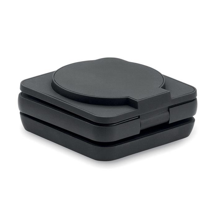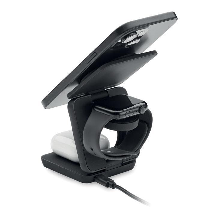 Station de charge pliable 3 en 1 en ABS recyclé caoutchouté. Elle comprend un chargeur magnétique sans fil 15W, un chargeur pour smartwatch (Apple® uniquement) et un chargeur TWS.