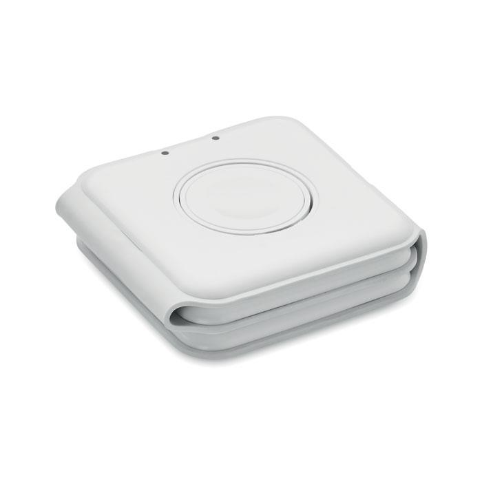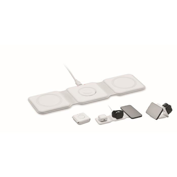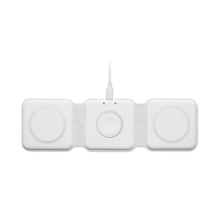 Station de charge pliable 3 en 1 en ABS. Elle dispose de 3 points de charge sans fil. Entrée : 2-en-1 Type-C et Type-A. Compatible avec tous les appareils compatibles QI, tels que les derniers Androïdes, iPhone® 8, X et plus récents. Également compatible avec l'iWatch.