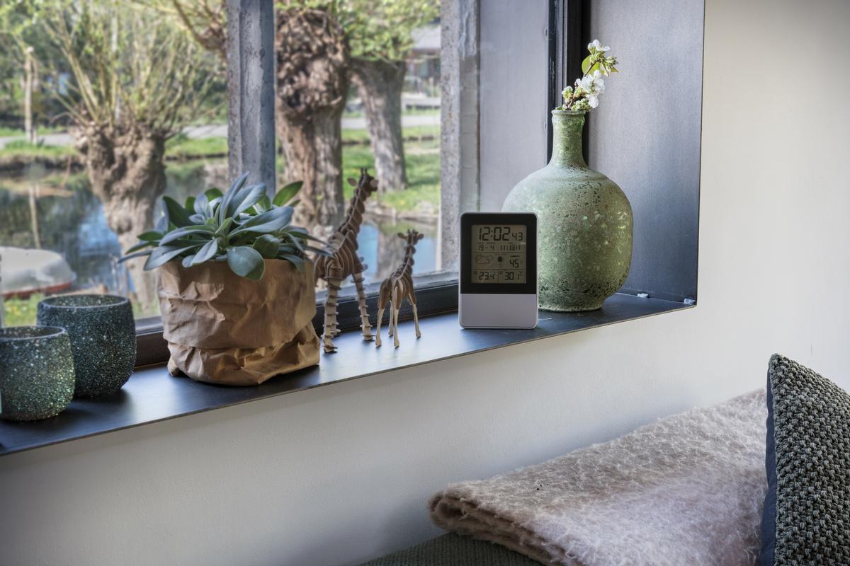 Station météo intérieur/extérieur avec écran LCD et capteur d’extérieur. Fonctions: montre et calendrier, température interne/externe, prévisions, taux d’humidité et alarme.