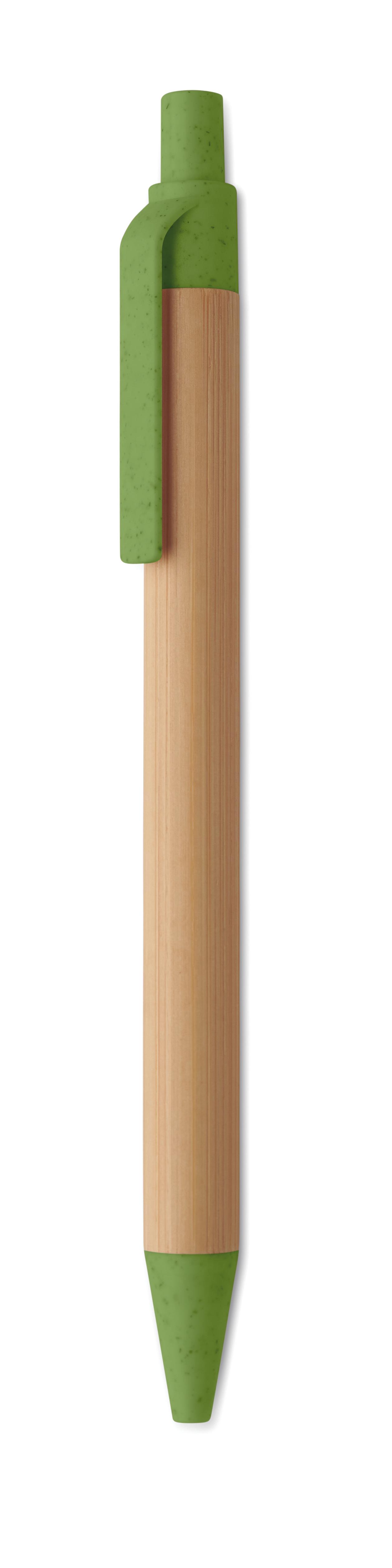 Stylo à bille à bouton poussoir avec corps en bambou et paille de blé (50%) et en plastique ABS (50%). Encre bleue.