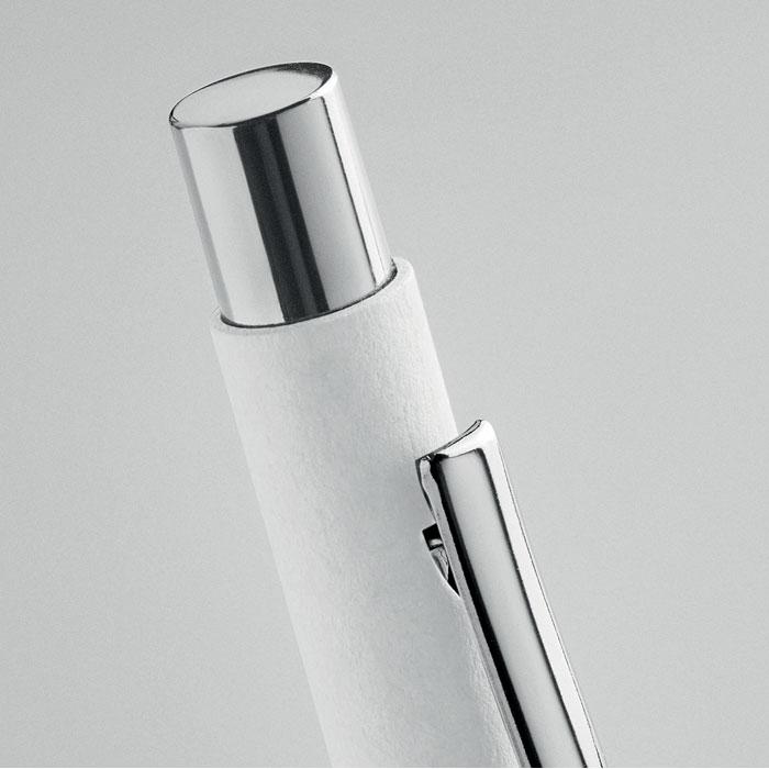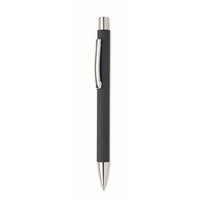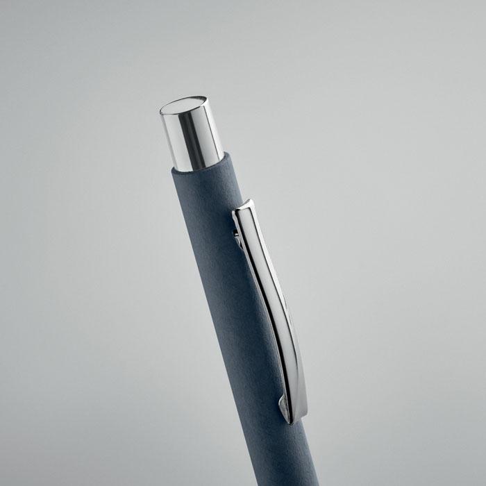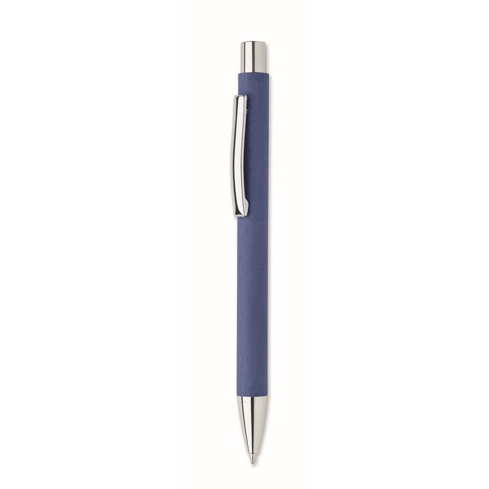 Stylo à bille à bouton poussoir en papier recyclé (50% ) et clip en métal. Encre bleue.