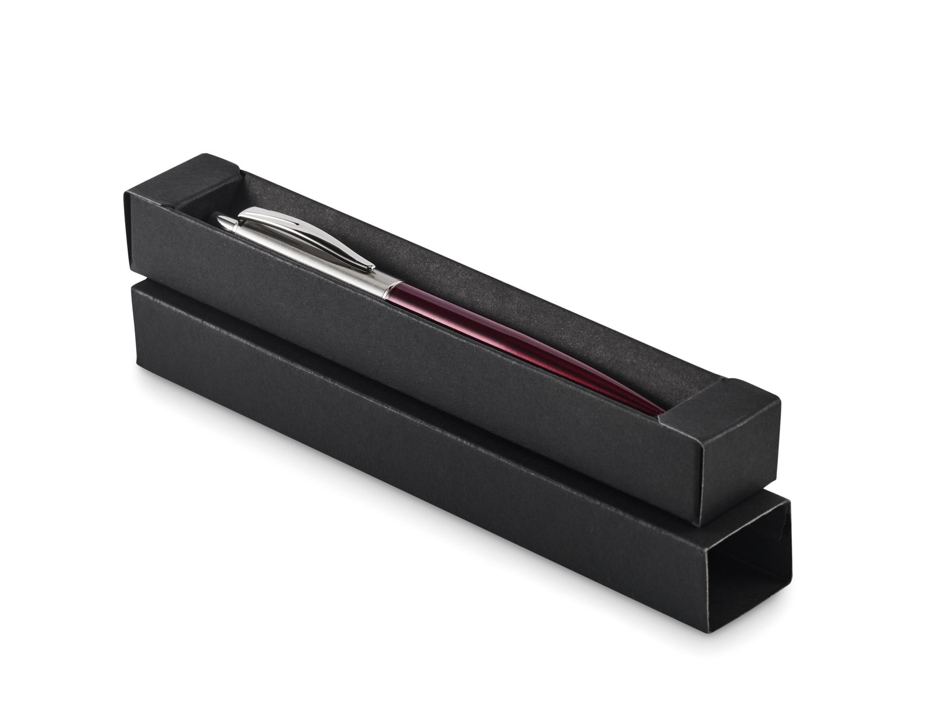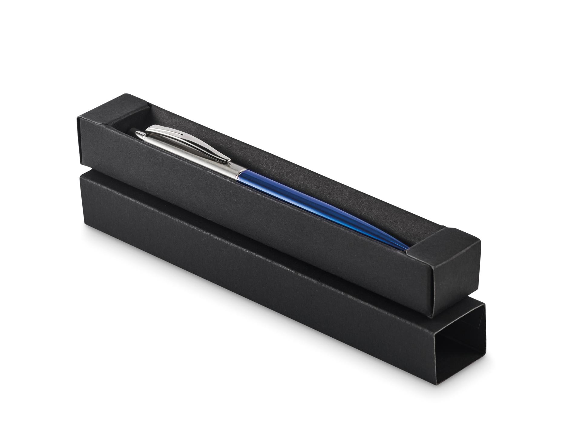 Stylo à bille à bouton poussoir dans un corps en acier inoxydable recyclé. Encre bleue. Présenté dans une boîte noire.