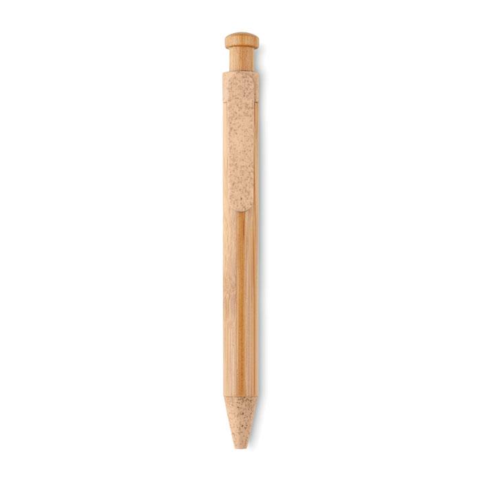 Stylo bille poussoir avec corps en bambou et paille de blé et détails en ABS. Encre bleue. Le bambou est un produit naturel, et présente de légères variations de couleur, de décoration et de tailles.