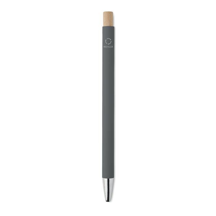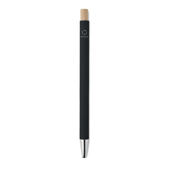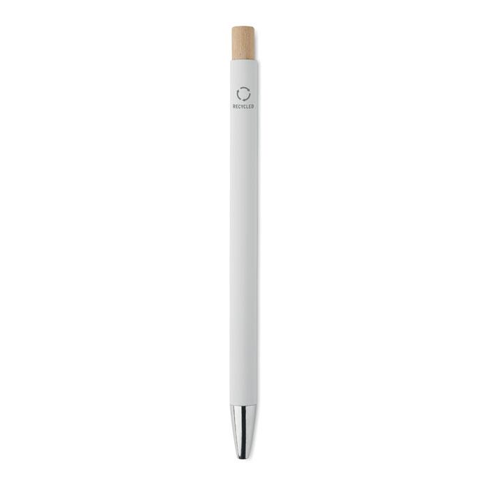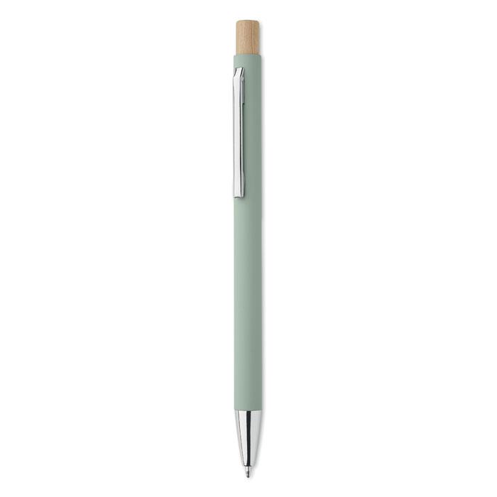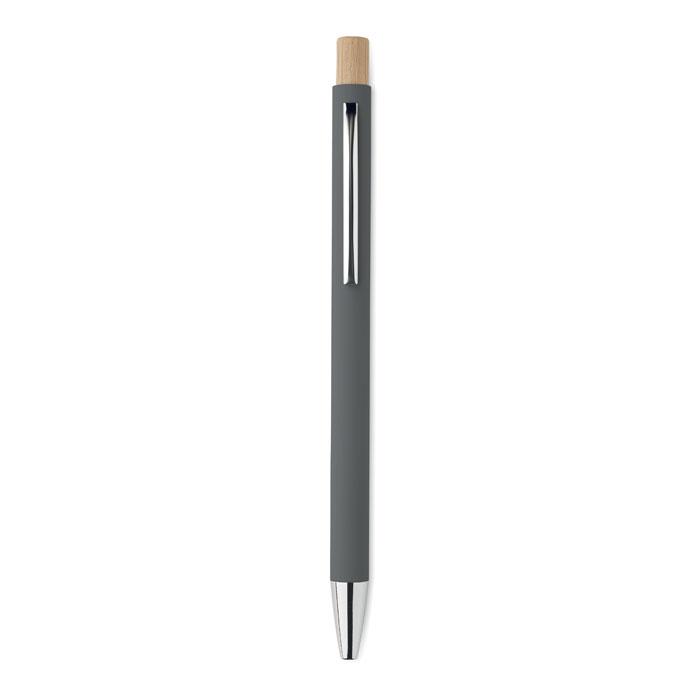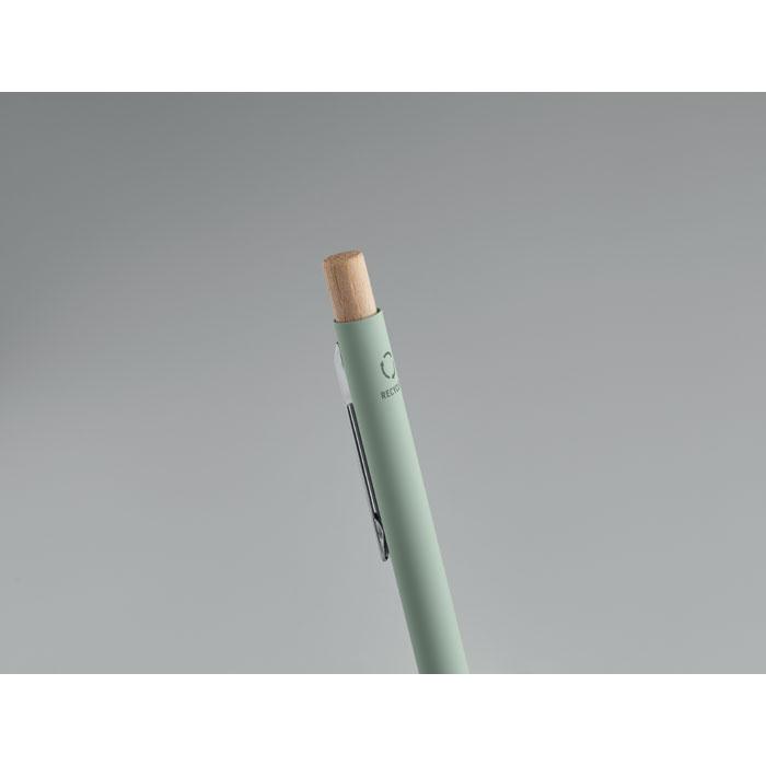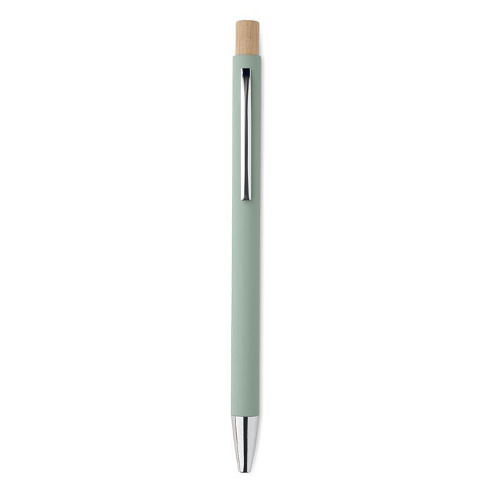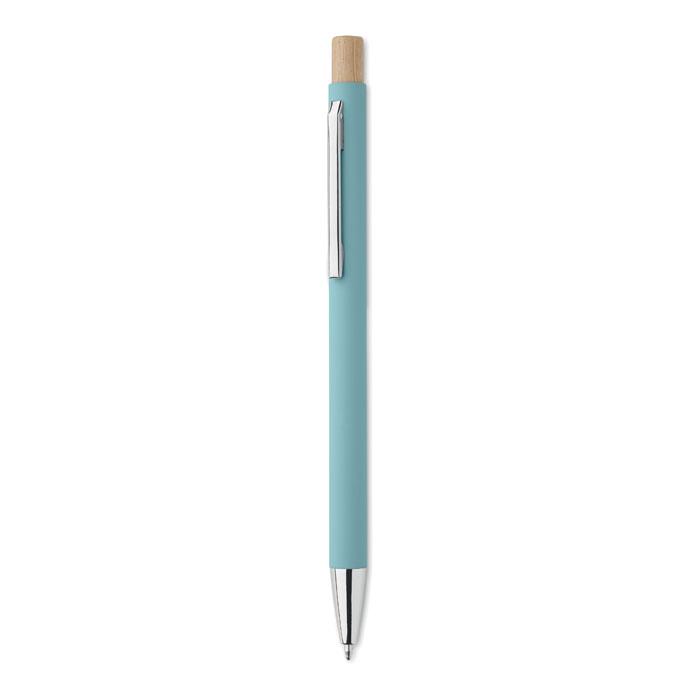 Stylo à bille en aluminium recyclé avec bouton poussoir en bambou. Pointe et clip argentés. Encre bleue.