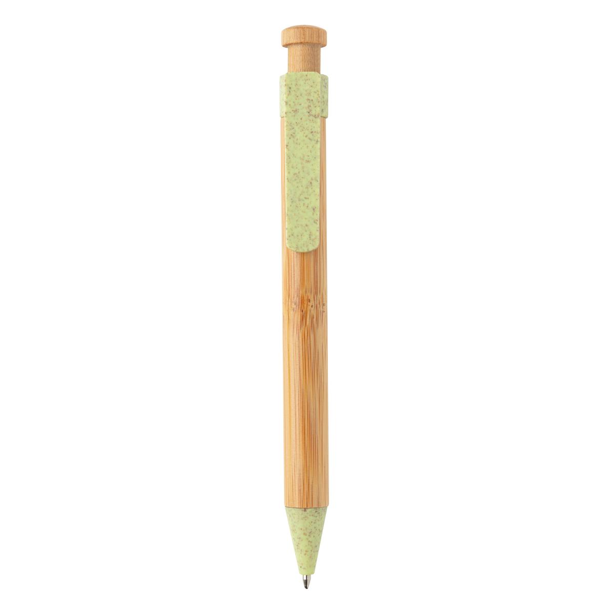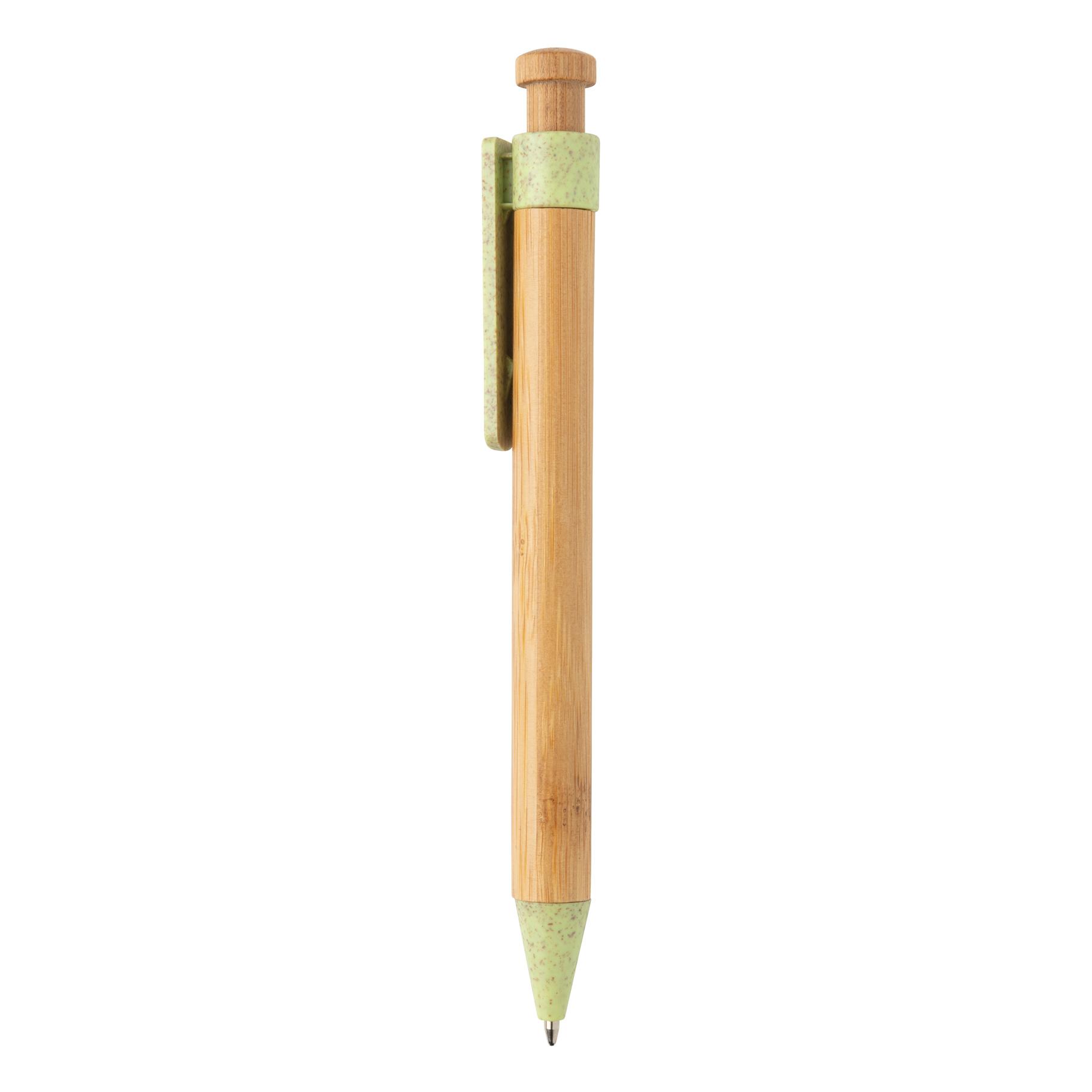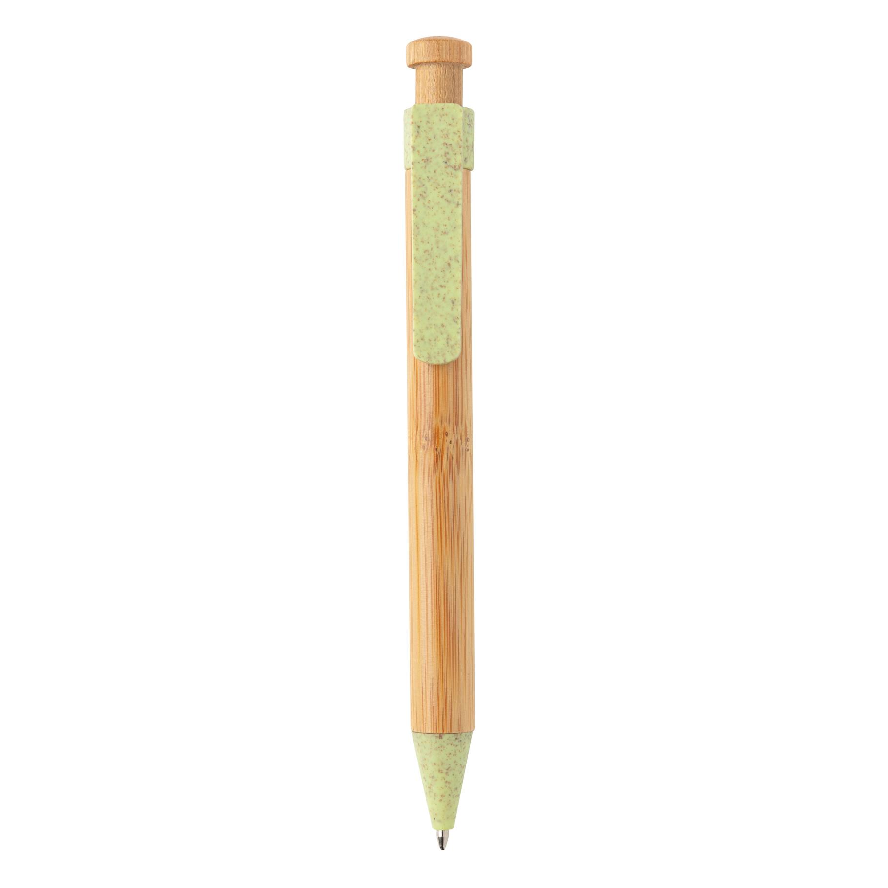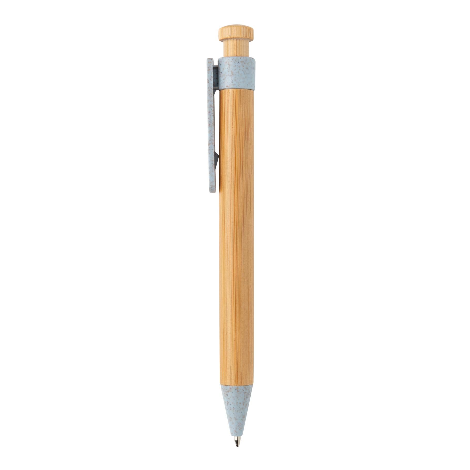 Stylo en bambou avec clip en fibre de paille de blé (composition : 60% de paille de blé et 40% ABS). Encre bleue Dokumental® de fabrication allemande pour +/- 1200m d’écriture et bille en carbure de tungstène assurant une écriture régulière.