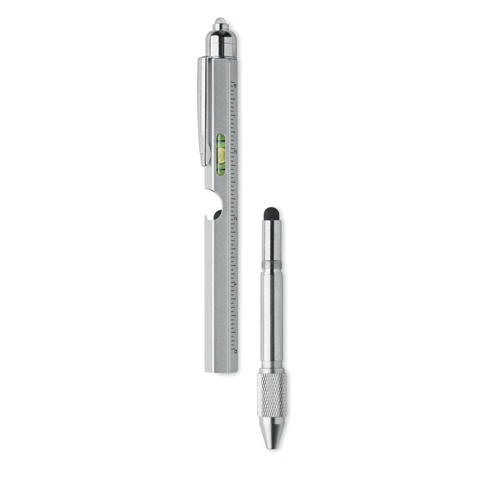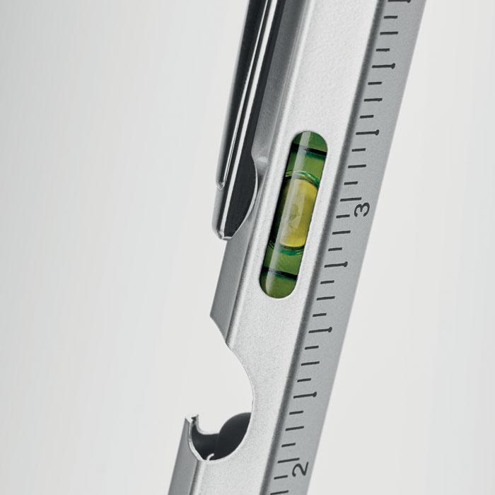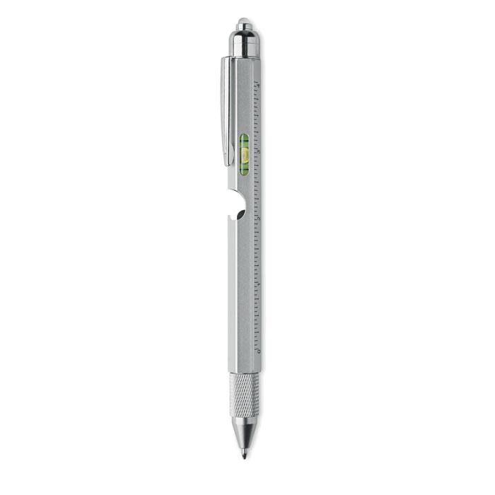 Stylo multifonctions en acier inoxydable incluant : niveau à bulle, règle, stylet, tournevis cruciforme et à tête plate, lampe LED. 3 piles AG incluses. Encre bleue.