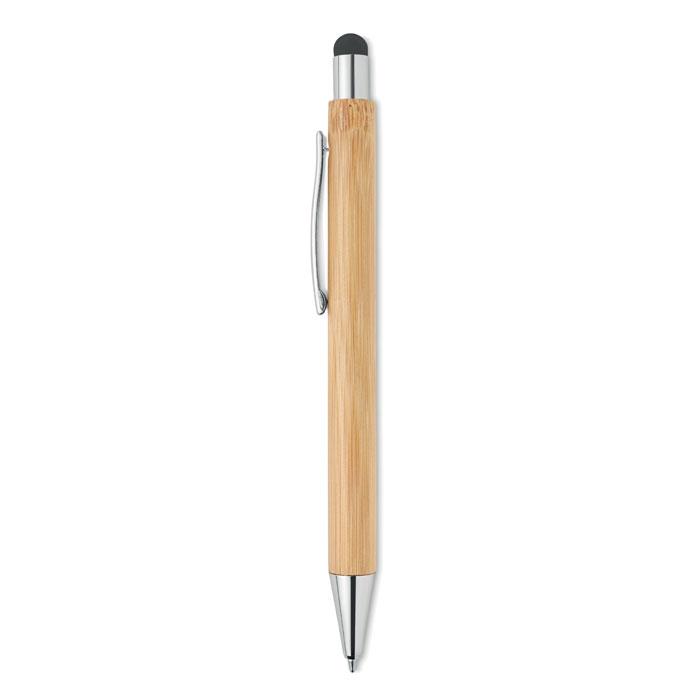 Stylo à bille à bouton poussoir en bambou avec stylet et attribut chromé brillant. Encre bleue. Le bambou est un produit naturel, il peut y avoir de légères variations de couleur et de taille par article, ce qui peut affecter le résultat final de la décoration.