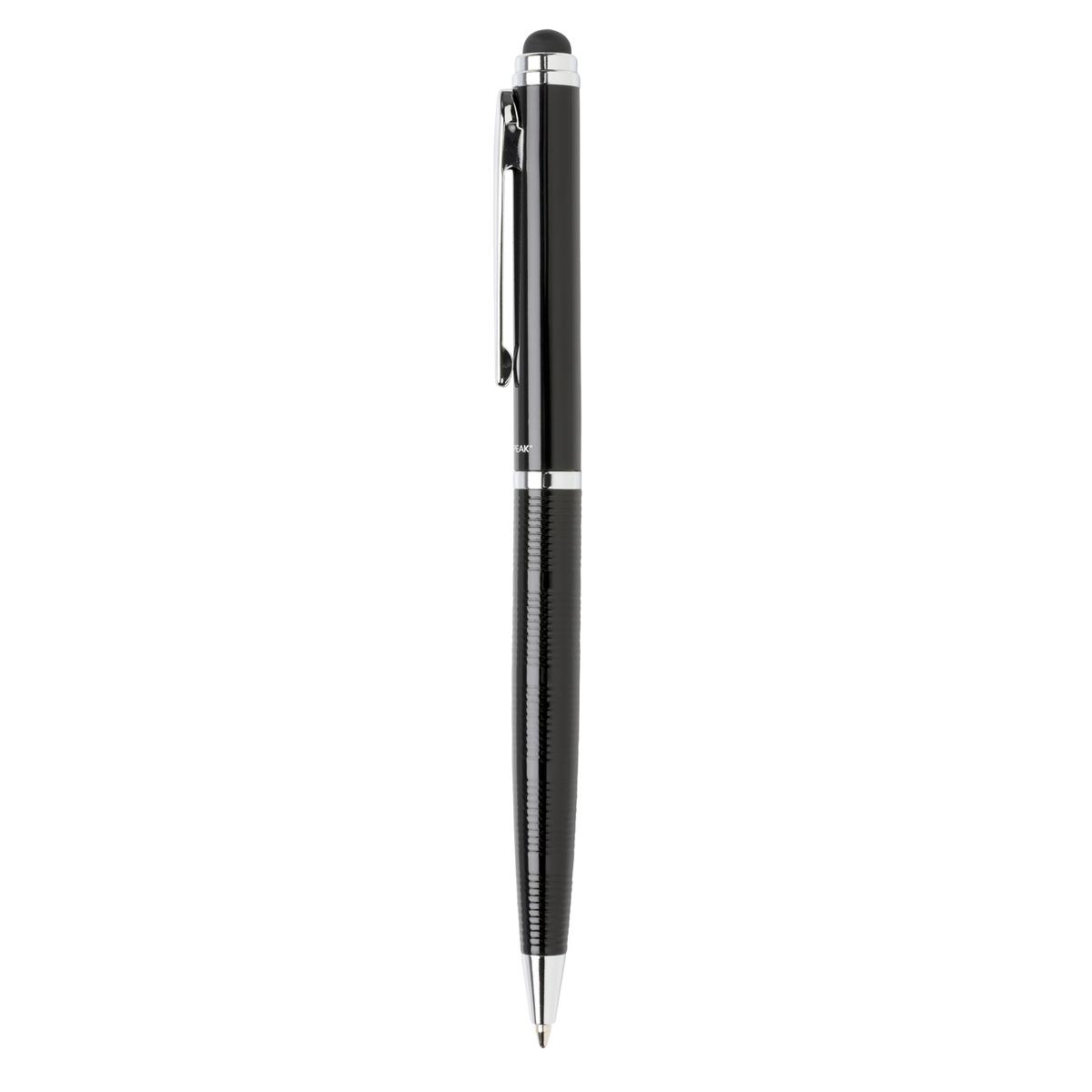Stylo à bille avec stylet Swiss Peak, corps en laiton et attributs en acier au design exclusif. Encre bleue Dokumental® de fabrication allemande pour +/- 1200m d’écriture et bille en carbure de tungstene assurant une écriture régulière. Livré dans un tube cadeau Swiss Peak.