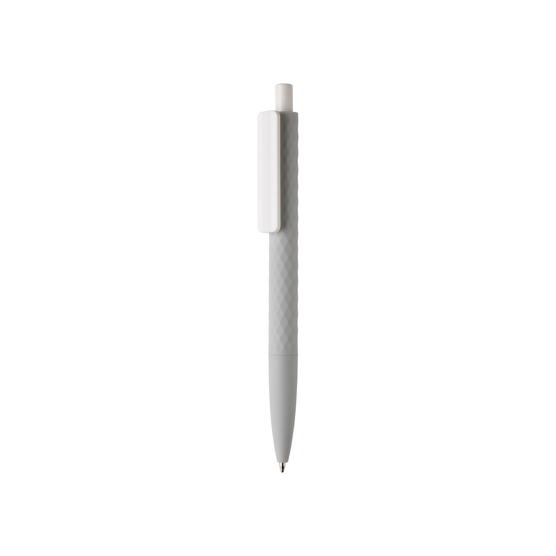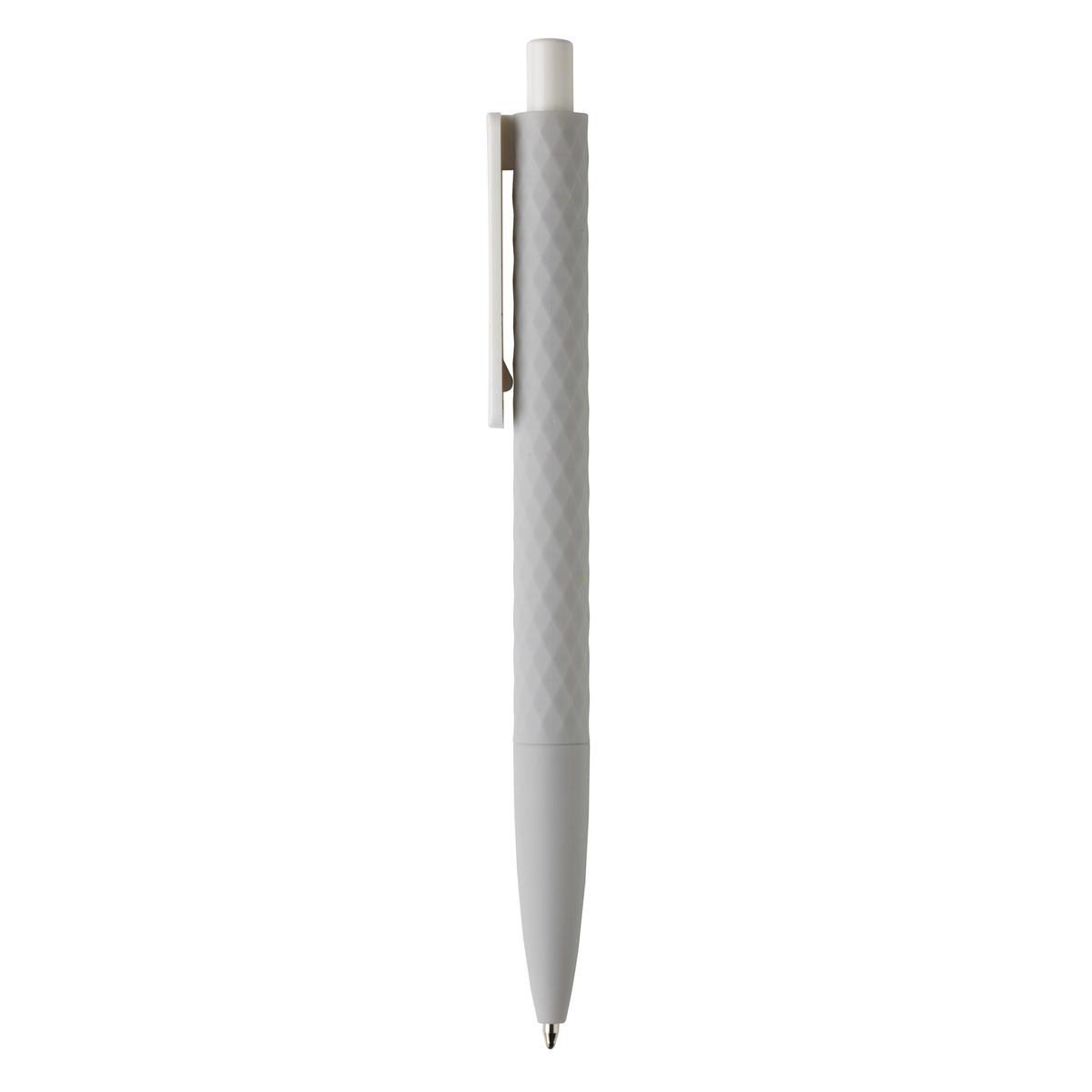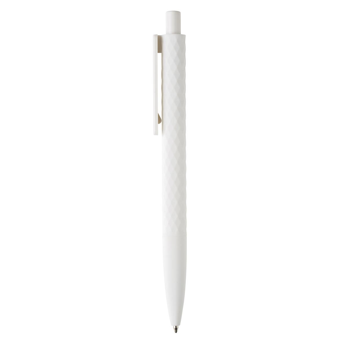 Stylo à bille rétractable en plastique avec finition losange texturé et attributs blanc. Nouvelle version avec finition gomme pour un confort d’écriture supplémentaire. Encre bleue Dokumental® de fabrication allemande pour +/- 1200m d’écriture et bille en carbure de tungstène assurant une écriture régulière.