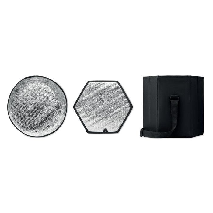 Siège ou table pliable en polyester 600D avec sac isotherme avec feuille d'aluminium et sangle de transport. Poids maximum 80 kg.