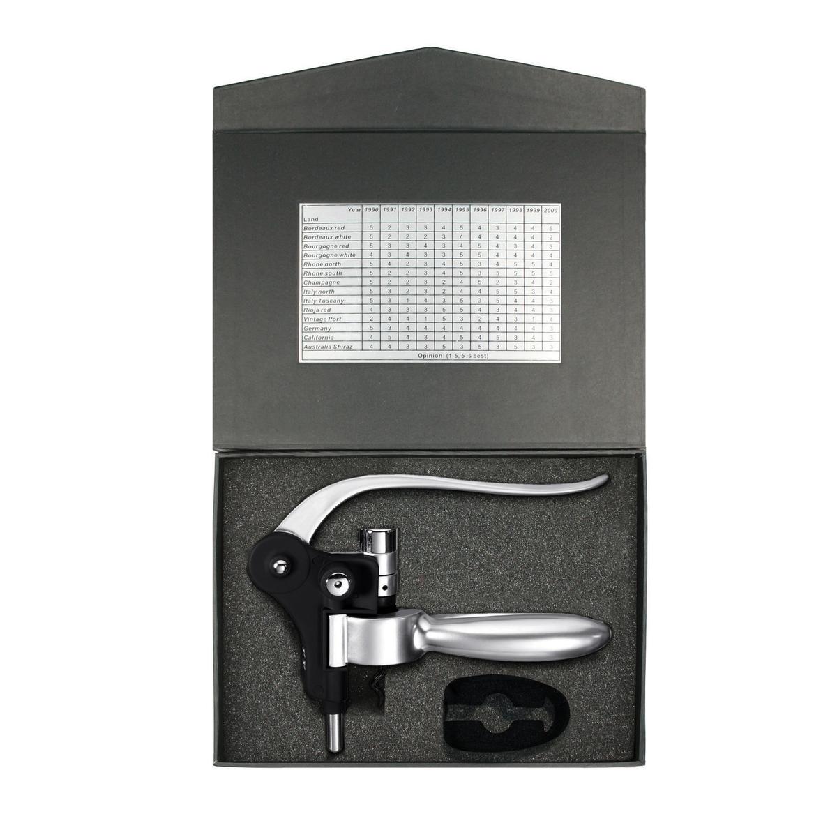 Tire-bouchon à système de levier, corps aluminium, spirale acier enduite de Téflon, coupe-capsule et plaque métal résumant les meilleurs vins depuis 1990.