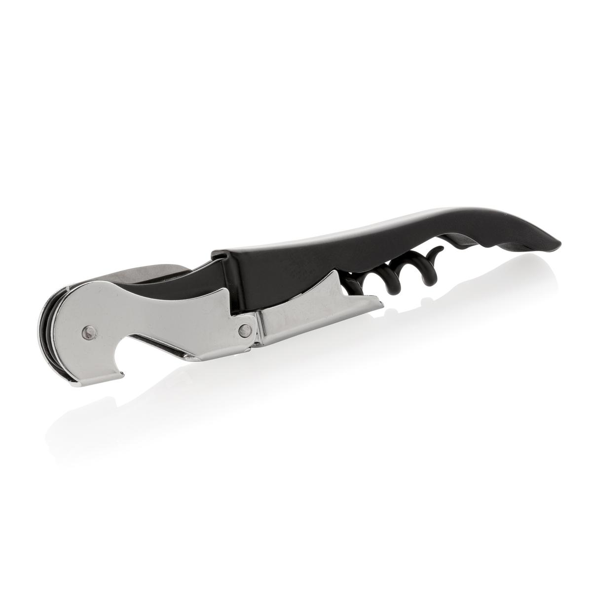 Tire-bouchon de serveur avec une lame de coupe capsule, d'un système d'ouverture à double levier et d´un décapsuleur. Emballé dans une boîte cadeau.