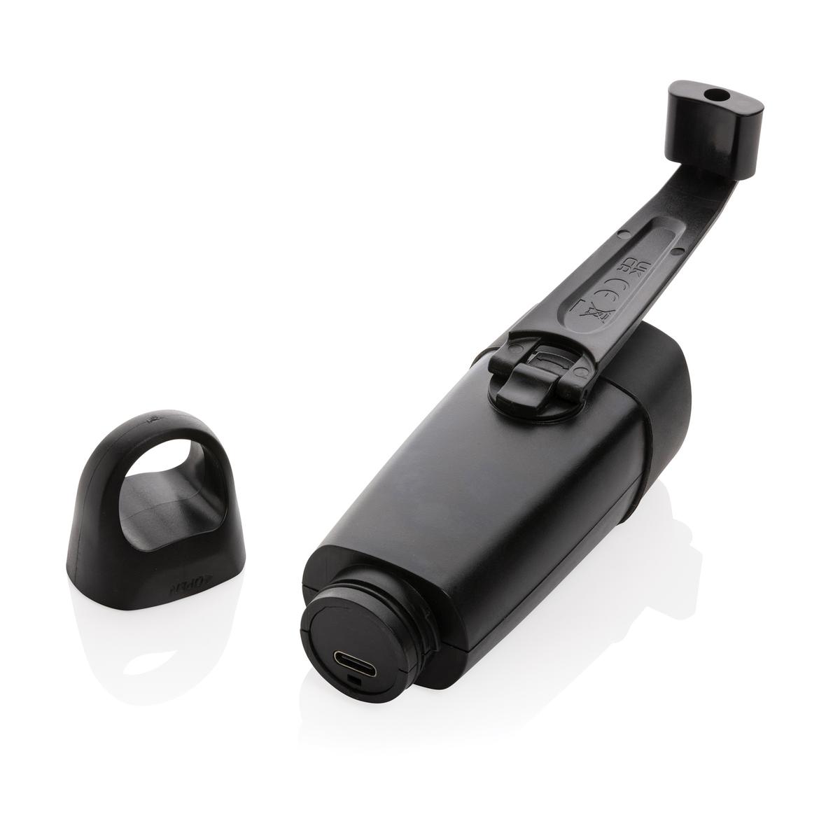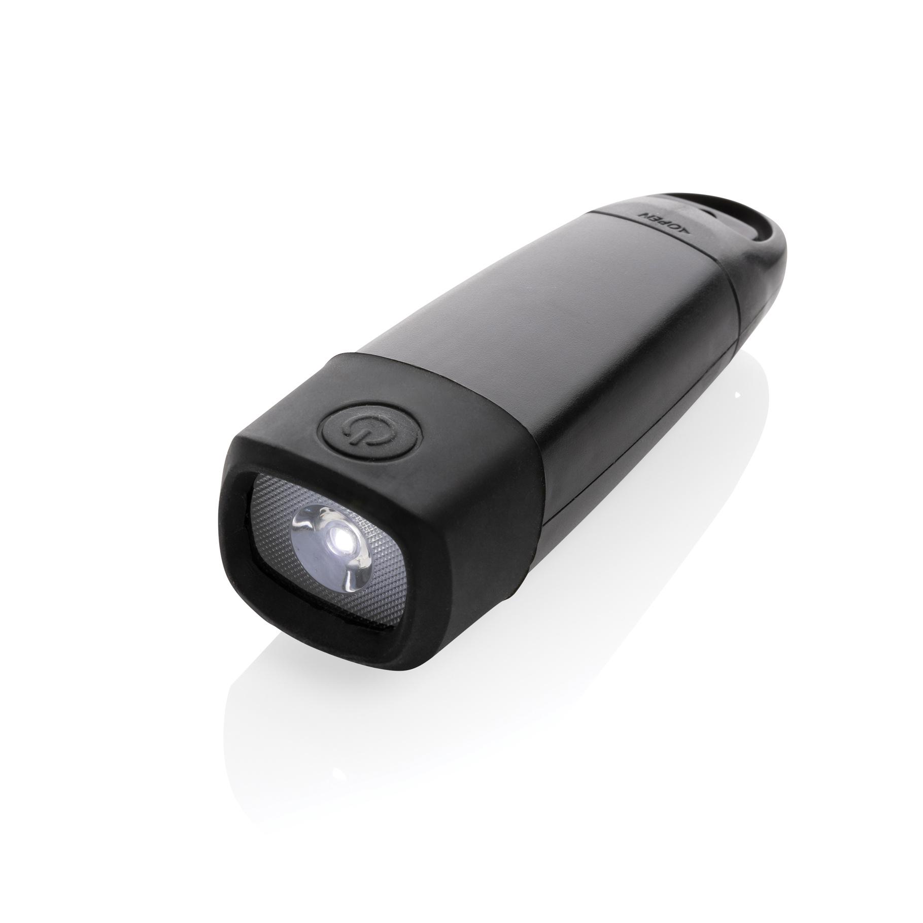 Torche en plastique ABS recyclé certifié RCS avec manivelle. Contenu recyclé total : 30 % sur la base du poids total de l'article. La certification RCS garantit une chaîne d'approvisionnement entièrement certifiée pour les matériaux recyclés. La torche utilise une batterie au lithium 620 mAh rechargeable de qualité A. Il n'est donc pas nécessaire de remplacer les piles. Il suffit de la recharger via une prise USB. Lumière LED de 120 lumens. Avec port de type C pour la recharge. Durée de fonctionnement avec une seule charge : 2 heures. La manivelle peut être utilisée pour ajouter de l'énergie en cas d'urgence.