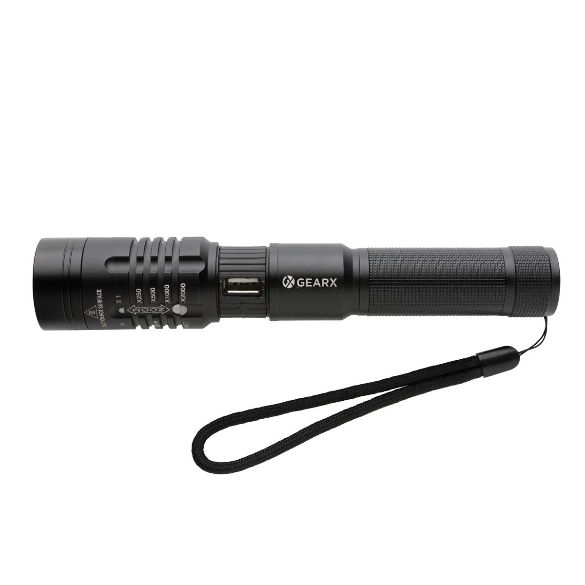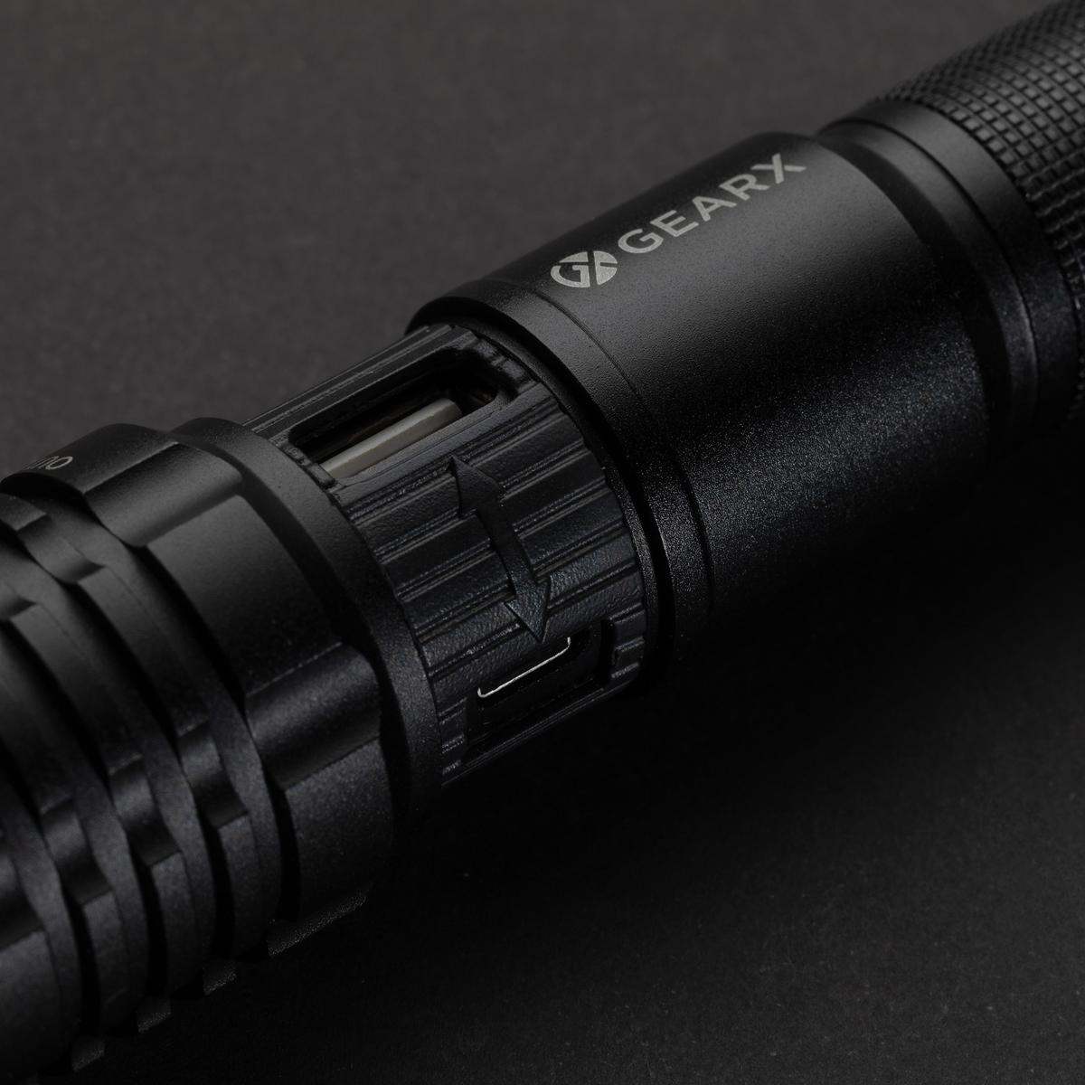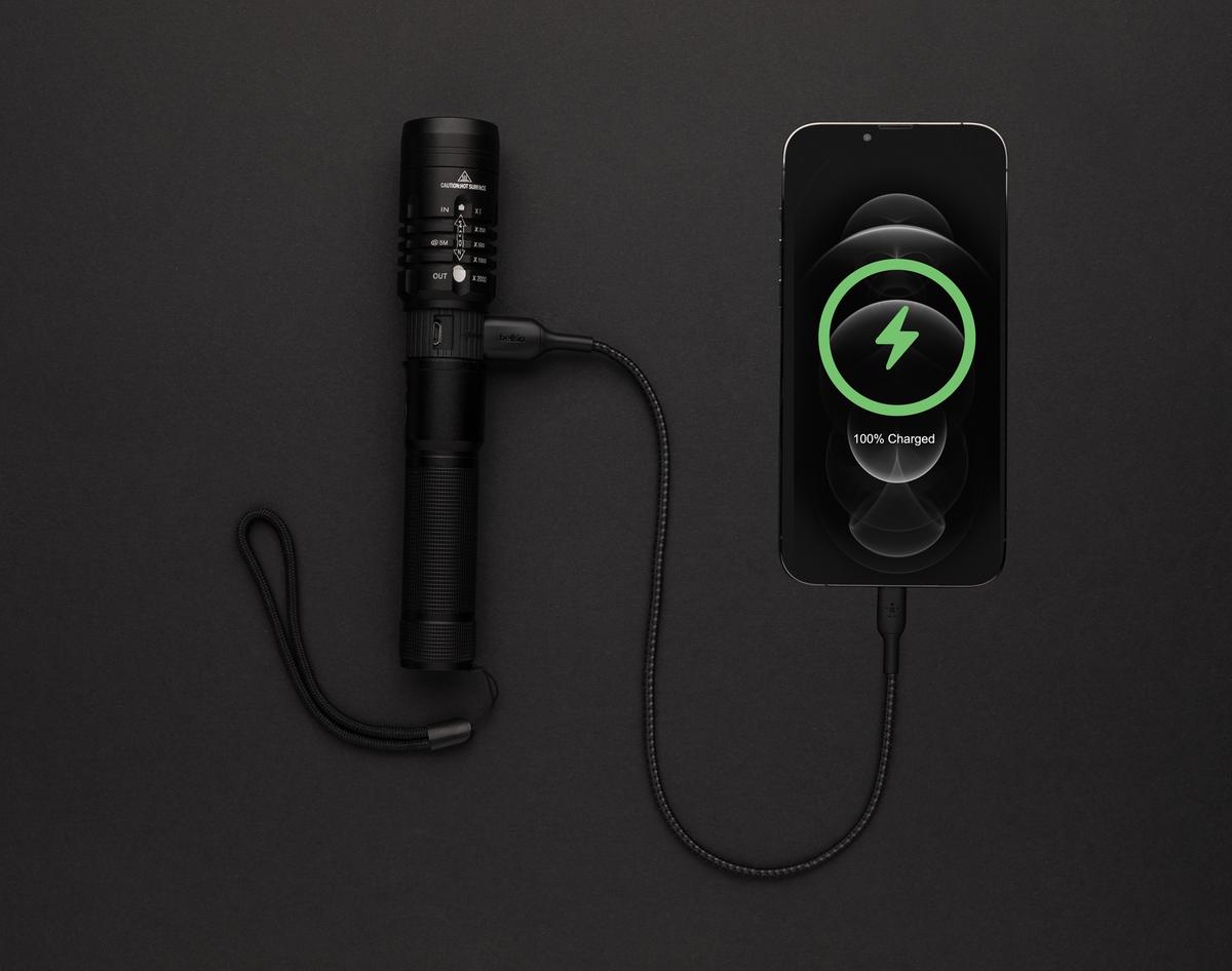 Lampe de poche rechargeable avec le corps en alliage d'aluminium de qualité et une batterie 2000 mAh pour une utilisation jusqu'à 4 heures sur une seule charge (via USB). Grâce à son indice IPX4, elle est résistante aux intempéries et peut donc facilement être utilisée à l'extérieur. L'ampoule puissante crée jusqu'à 1000 lumens et un faisceau qui atteint jusqu'à 500 mètres. L'ampoule de haute qualité est dotée de 5 modes, dont la fonction SOS.