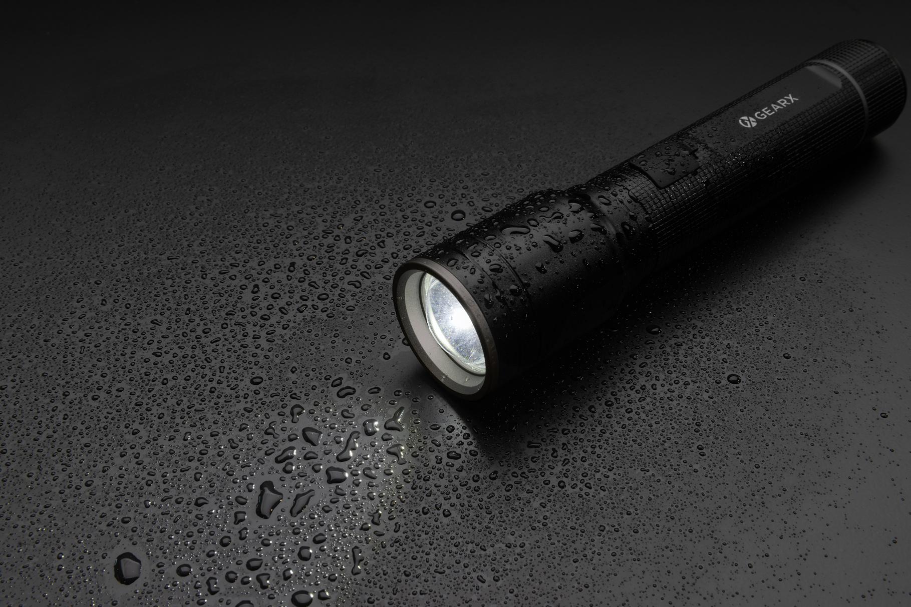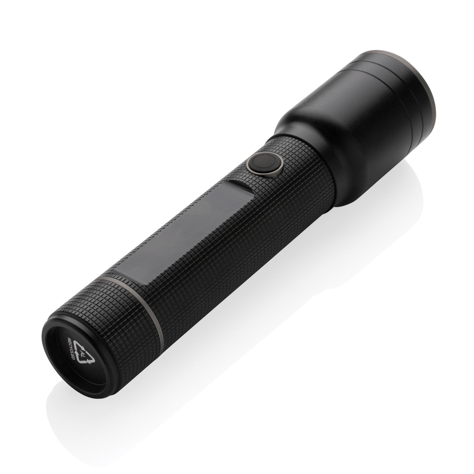 Lampe de poche 10W rechargeable fabriquée avec de l'aluminium recyclé certifié RCS. Contenu recyclé total : 20 % sur la base du poids total de l'article. La certification RCS garantit une chaîne d'approvisionnement entièrement certifiée pour les matériaux recyclés. Grâce à son indice de protection IPX4, elle peut donc être facilement utilisée à l'extérieur. L'ampoule puissante produit jusqu'à 1500 lumens et un faisceau qui atteint jusqu'à 800 mètres. Il suffit de la recharger via une prise USB et le câble de type C recyclé certifié RCS inclus. L'ampoule de haute qualité est dotée de 5 modes, dont la fonction SOS. La batterie de 4000 mAh permet une utilisation jusqu'à 10 heures sur une seule charge et permet de charger vos appareils mobiles via le type C. L'aluminium ne perd pas ses caractéristiques dans le processus de recyclage et peut être recyclé à l'infini. L'article et les accessoires sont 100 % sans PVC. Emballé dans un emballage FSC mix. Entrée Type-C 5V, 1A ; Sortie 5V, 1A.