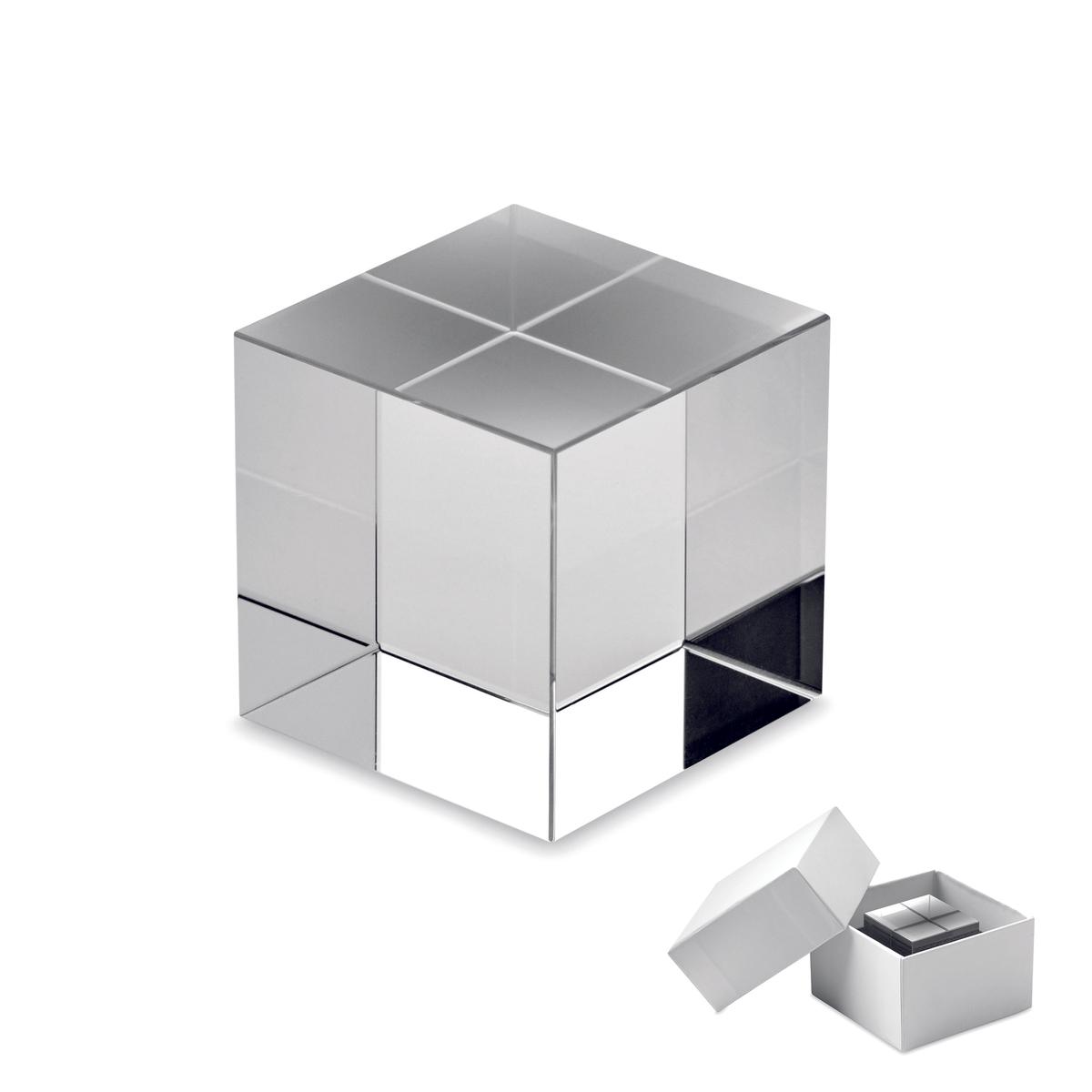 Prix ou trophée en forme de cube en verre. Présenté dans une boîte cadeau.