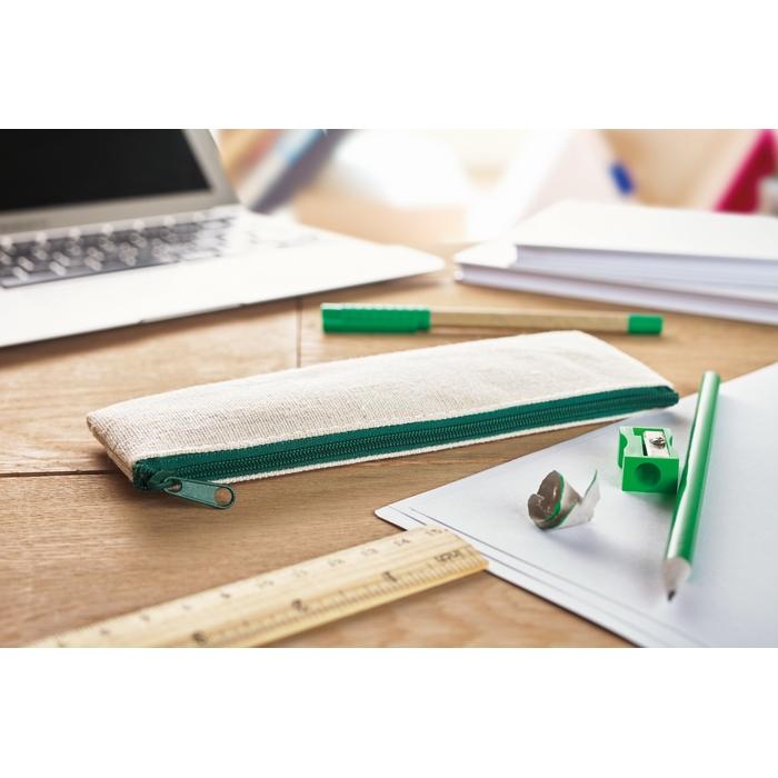 Trousse en jute et coton avec gomme, crayon à papier, stylo corps en carton et encre bleue, règle en bambou, taille-crayon en bois.