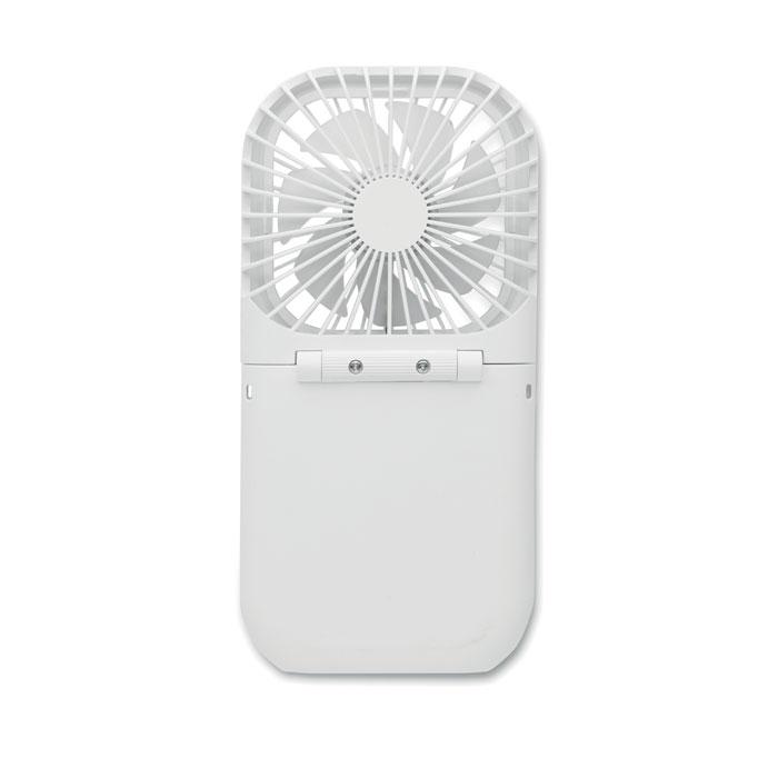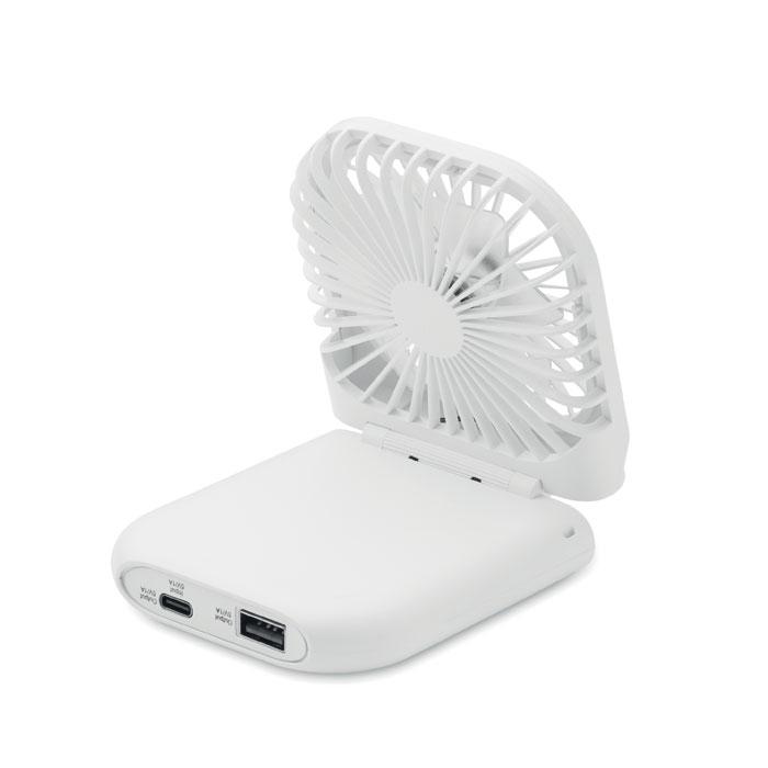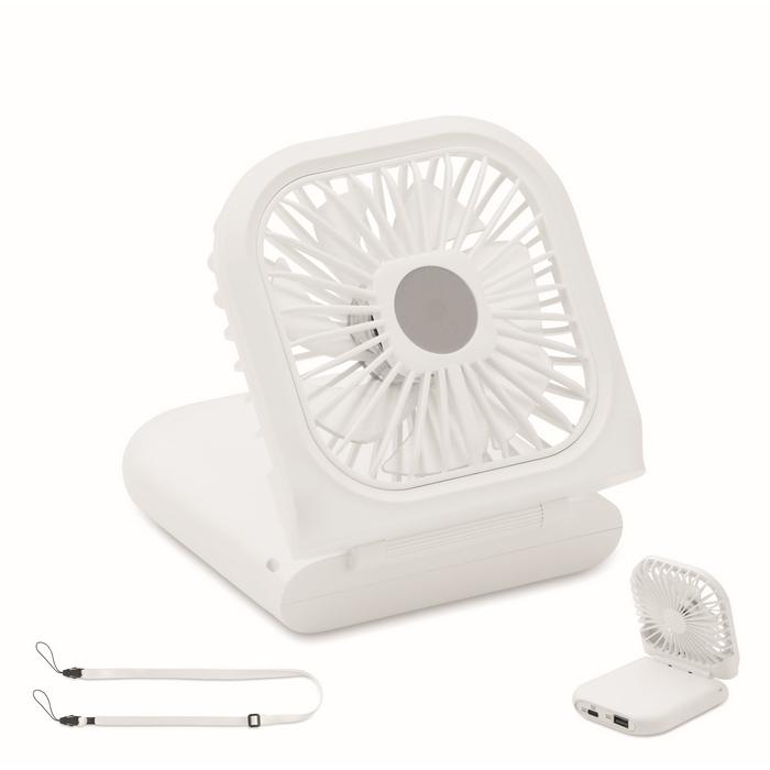 Ventilateur portable pliable avec lanyard réglable. 4 vitesses. Peut également être utilisé comme ventilateur de bureau lorsqu'il est plié. Powerbank rechargeable 3000 mAh. Entrée type C. Sortie type A et C.