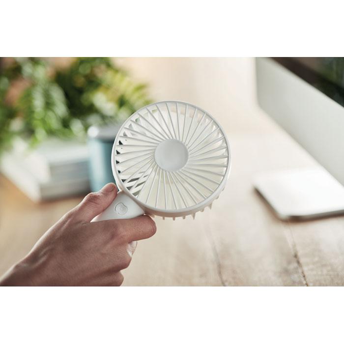 Petit ventilateur portable avec support supplémentaire pour utilisation comme ventilateur de bureau. 3 niveaux de vitesse. Batterie rechargeable 2000 mAh.