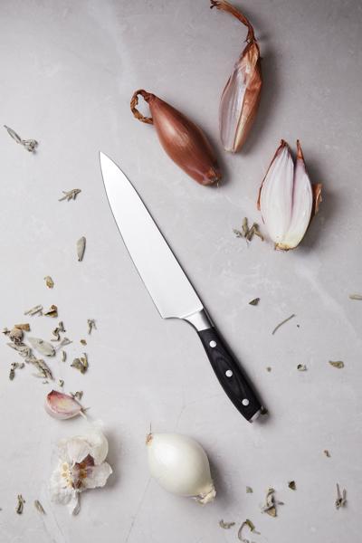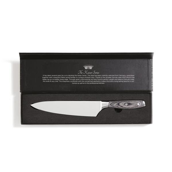 Couteau de chef en acier allemand X50CrMoV15 avec un manche en pakkawood. Le manche facile à saisir et le superbe équilibre de la lame rendent le couteau confortable et facile à utiliser. Taille : Lame de 20 cm.