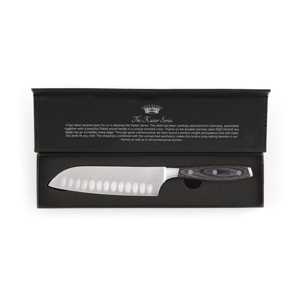 Couteau Santoku en acier allemand X50CrMoV15 avec manche en pakkawood. Le manche facile à saisir et le superbe équilibre de la lame rendent le couteau confortable et facile à utiliser. Taille : Lame de 14 cm.