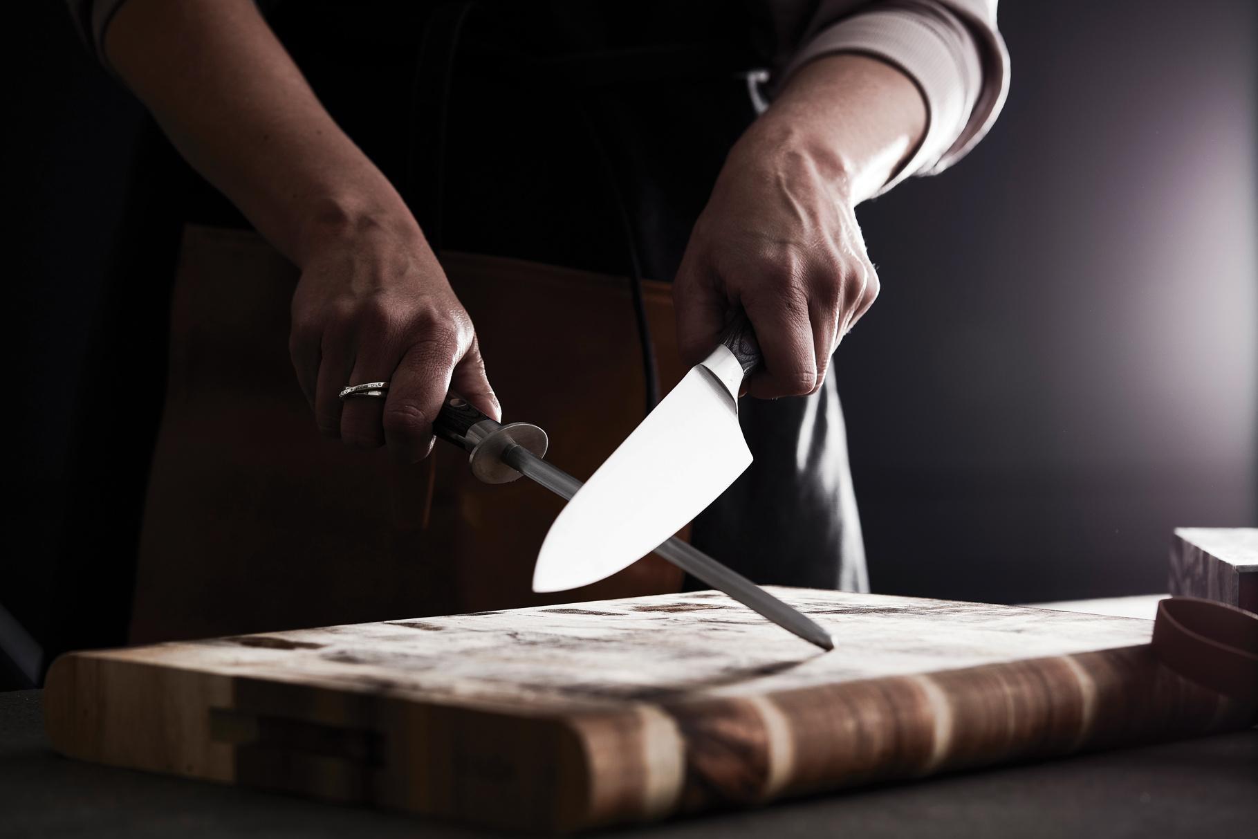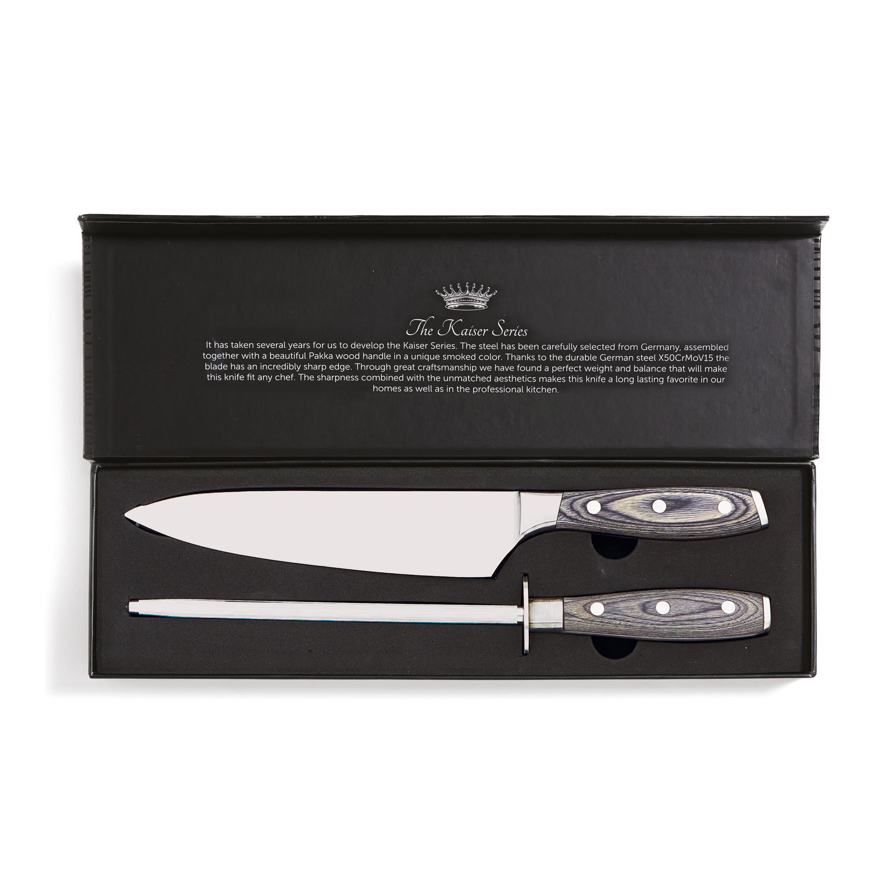 Couteau de chef et fusil en acier de la gamme Kaiser. Le couteau est fabriqué en acier allemand X50CrMoV15 et le manche en pakkawood. Le manche facile à saisir et le superbe équilibre de la lame rendent le couteau confortable et facile à utiliser. Les propriétés inhérentes à l'acier allemand rendent la lame résistante aux taches et ne nécessitent pas plus d'entretien qu'un affûtage occasionnel. Couteau de chef : Lame de 20 cm. Fusil en acier : 33 cm.