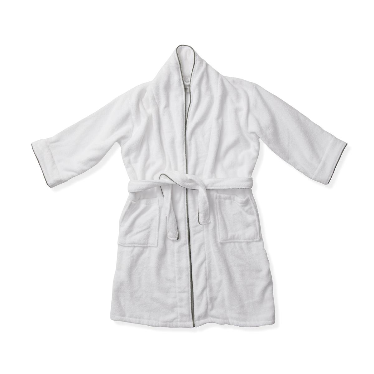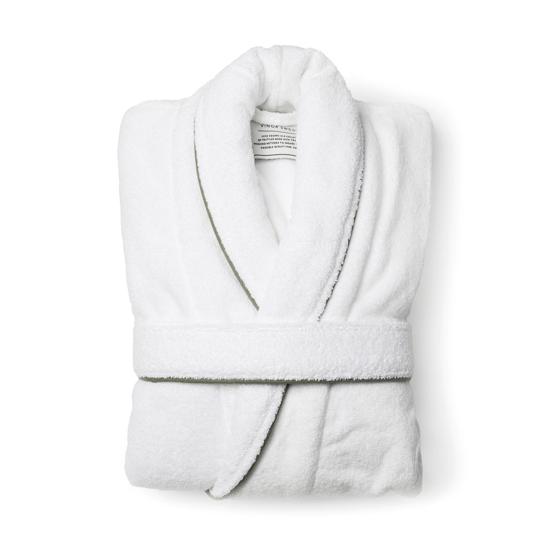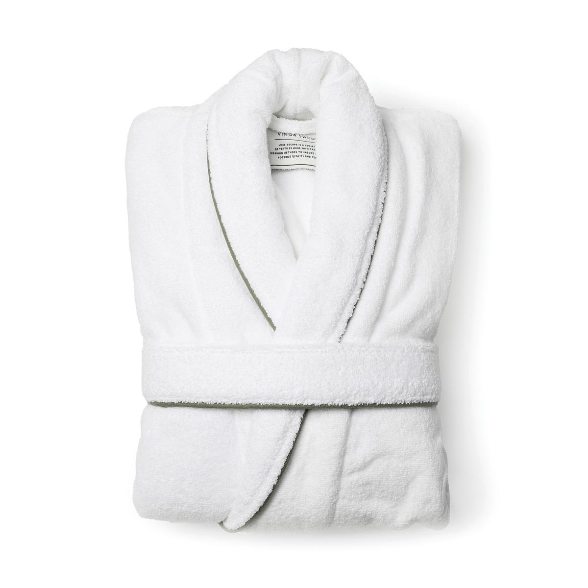 Peignoir luxueux 100% coton. Le peignoir est un modèle classique avec un col extra large et une ceinture à la taille. Il présente également plusieurs détails sympathiques, tels que des coutures fermées et un passepoil contrastant sur le col. Fabriqué à partir d'une longue fibre de coton avec des fils non tordus. Le résultat est un peignoir incroyablement doux que vous ne voudrez jamais enlever. OEKO-TEX® STANDARD 100. 09.HIN.68091. Hohenstein HTTI.