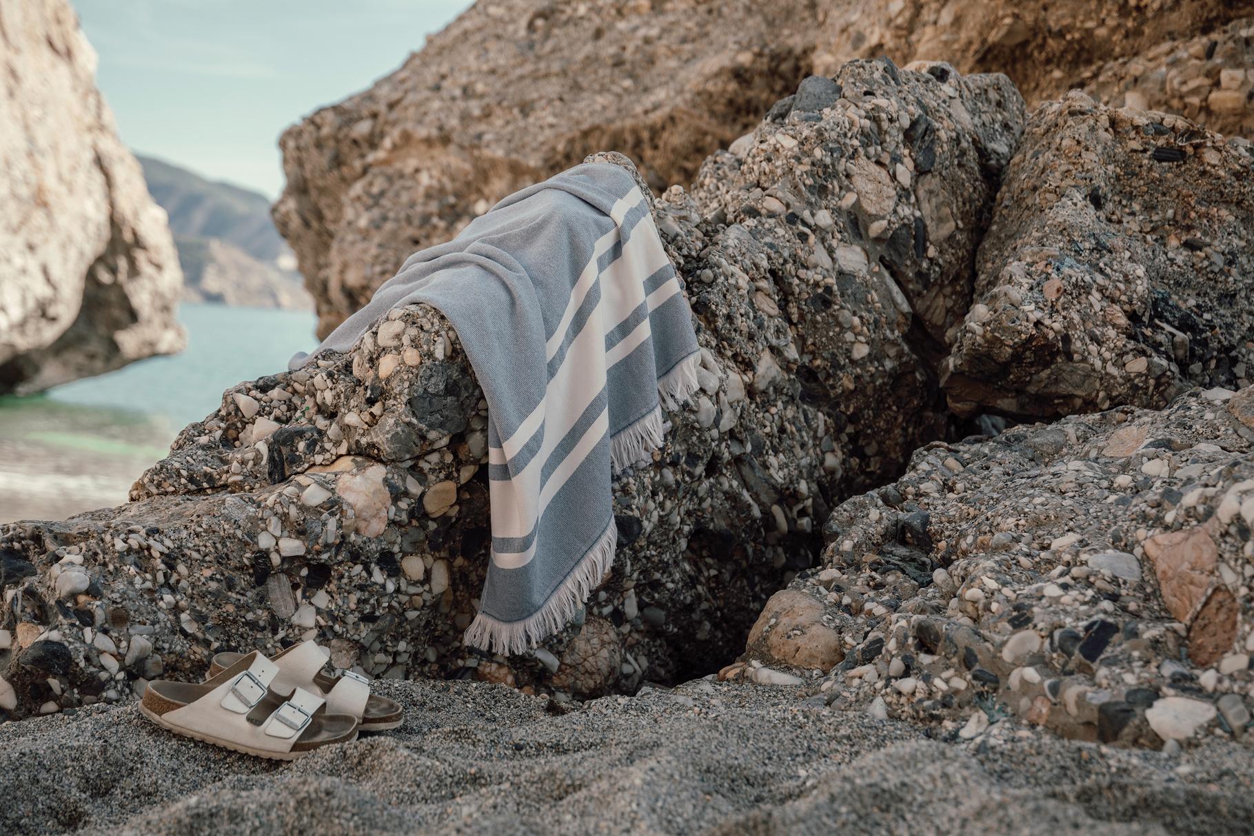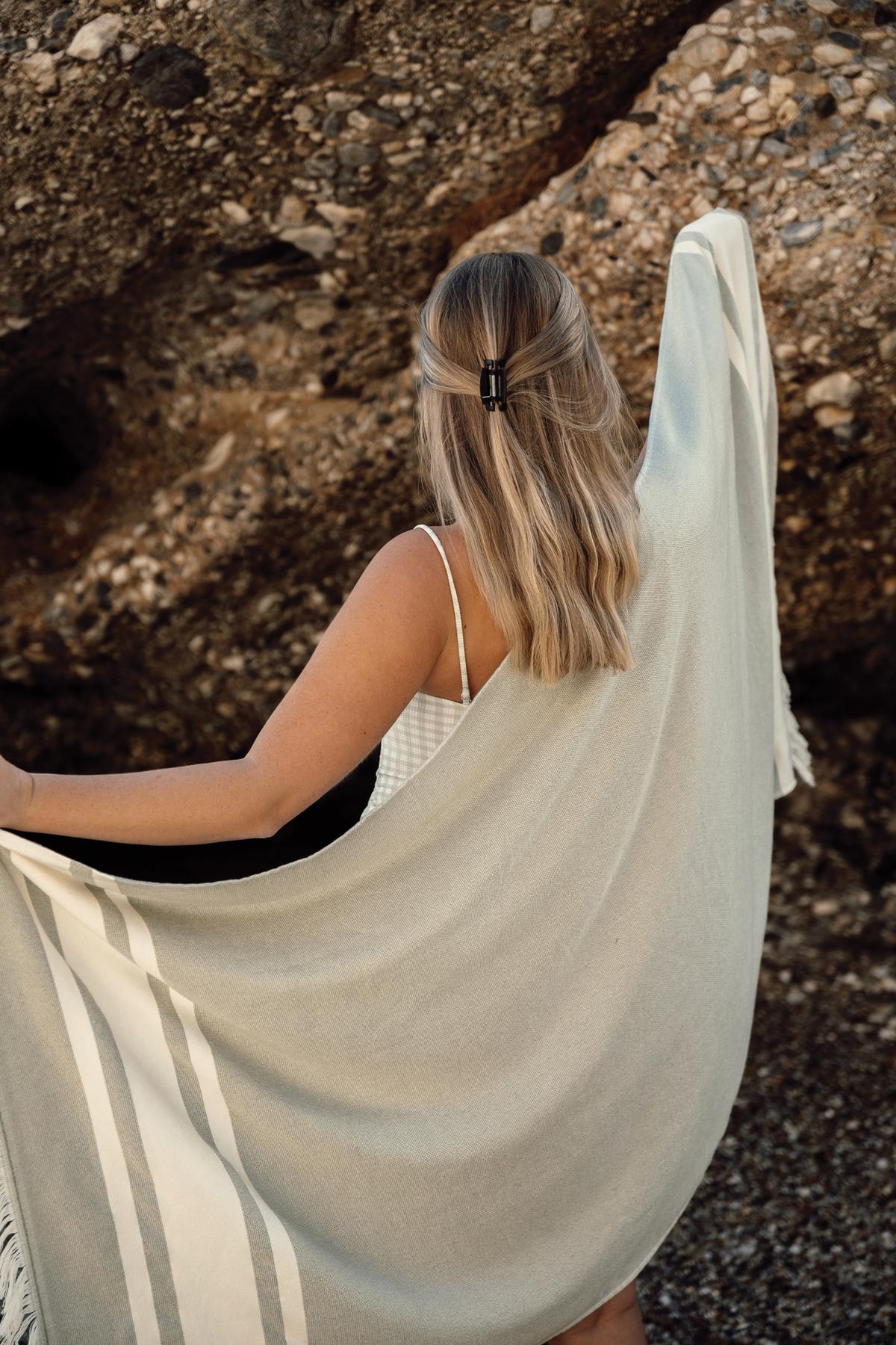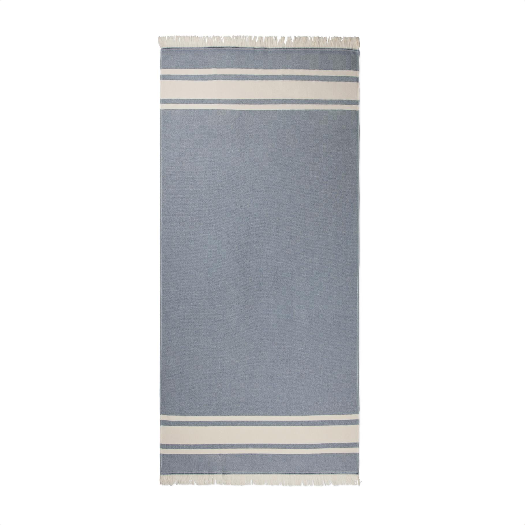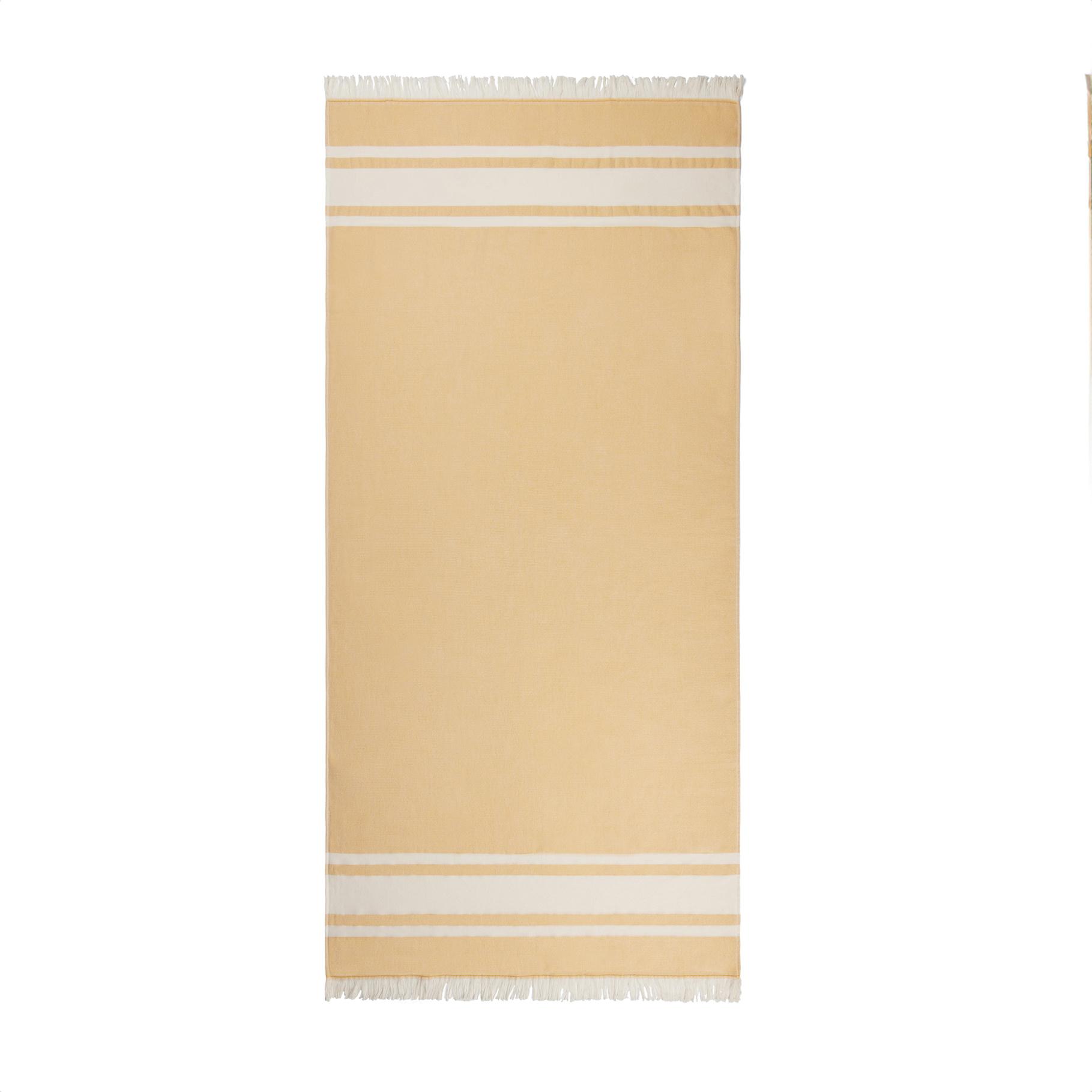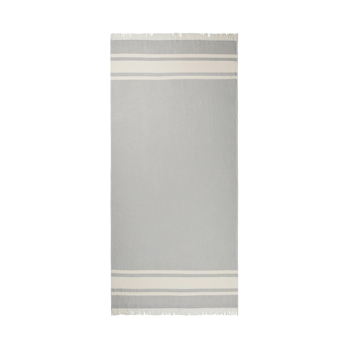 Serviette de hammam conçue avec deux types de textures différentes, une face en éponge et l'autre en tissage uni. La conception à deux faces fait de cette serviette le compagnon idéal lorsque vous êtes à la plage, au bord de la piscine ou lors d'une aventure en plein air. Elle a un excellent pouvoir d'absorption et sèche rapidement. La serviette est fabriquée à partir de 75% de coton et de 25% de polyester et a une épaisseur de 360 g/m². Dimensions : 180x80 cm, franges de 5 cm exclues. OEKO-TEX® STANDARD 100. 09.HIN.68091. Hohenstein HTTI.