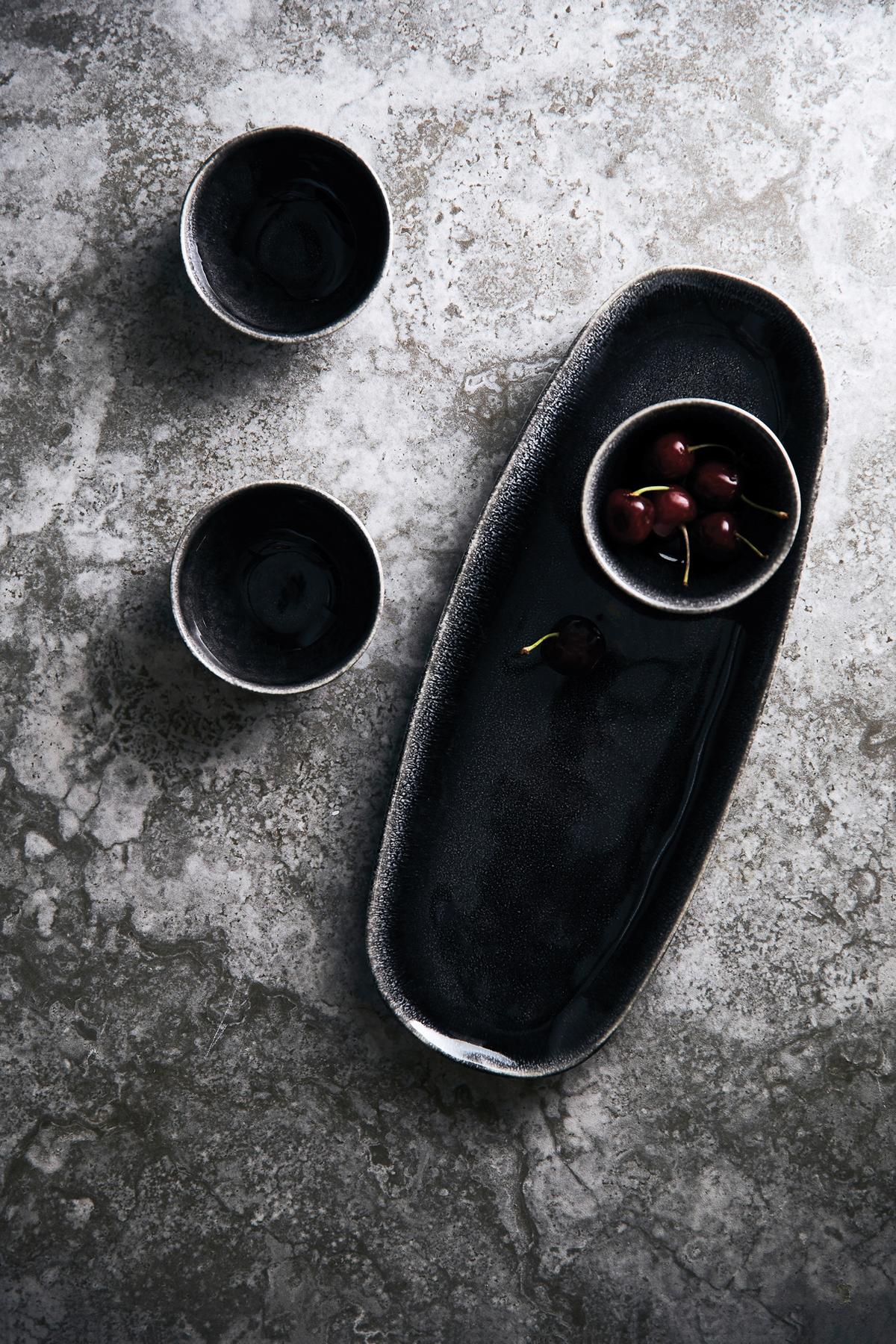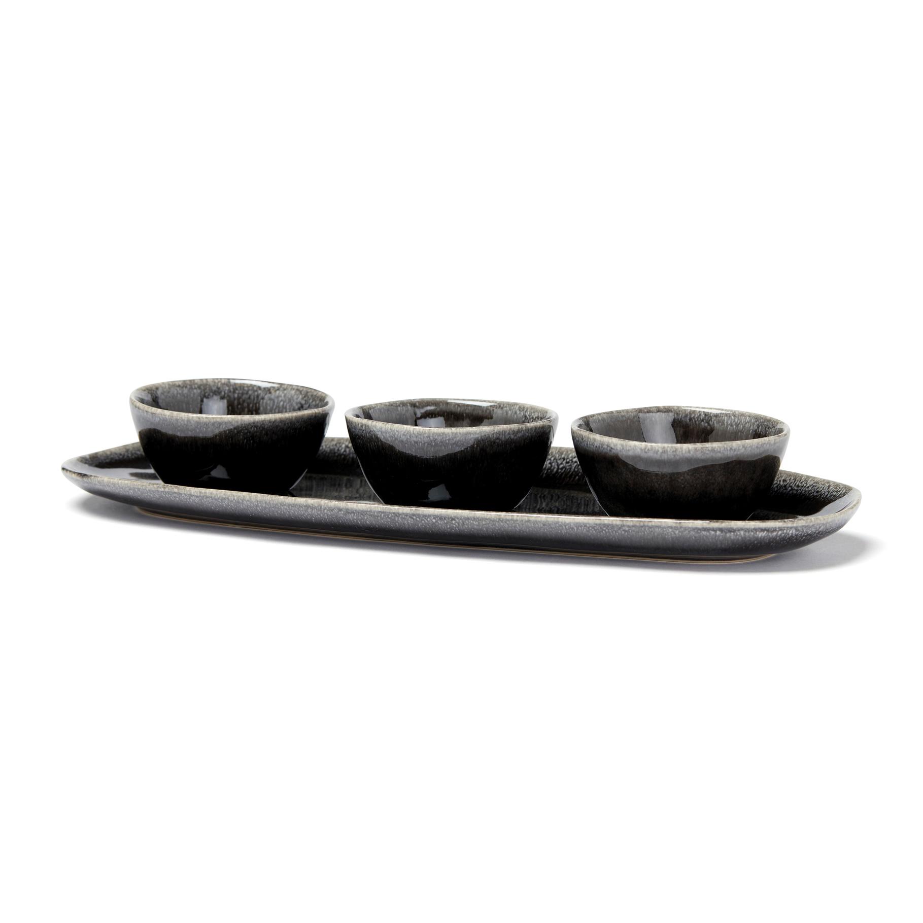 Ensemble de service en grès avec trois petits bols. Possibilités illimitées : Tapas, dips ou snacks. Le plat de service seul est idéal pour servir des salades ou des canapés. Nomimono puise son inspiration dans la nature et la terre qui nous entoure, créant cette gamme rustique dans des tons de terre naturels où il n'y a pas deux articles identiques. Le japonais rencontre le scandinave, le rustique rencontre le moderne. Des objets de collection pour un service terre-à-terre et inspirant. Chaque article est fait à la main et unique. Chaque article est examiné trois fois pour obtenir le bon type de finition. Passe au lave-vaisselle et au micro-ondes.