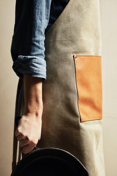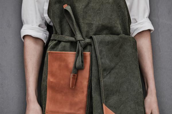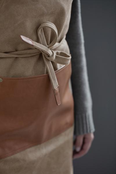 Tablier robuste en toile lavée 500 g/m² avec détails en PU. Un tablier qui vieillit avec dignité.