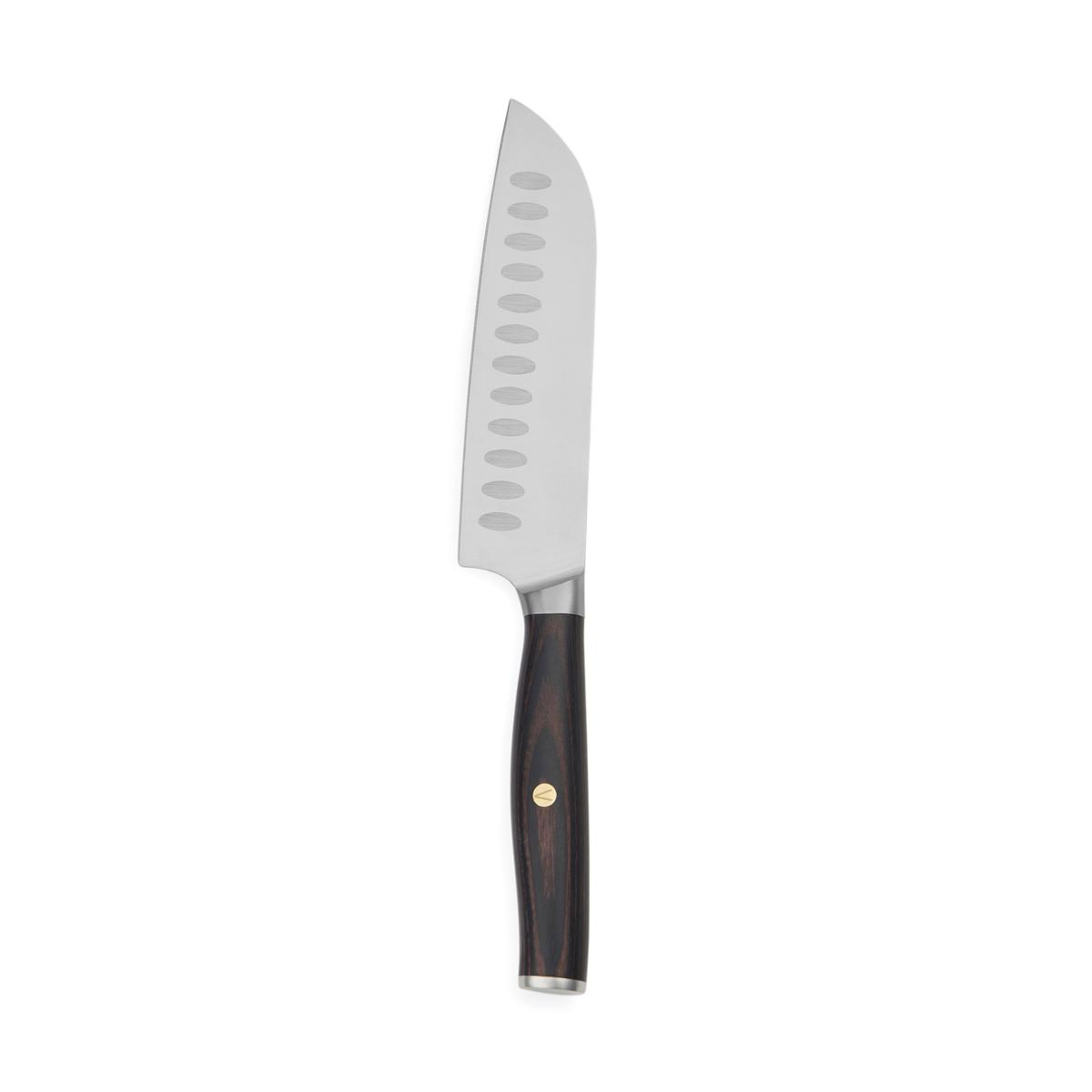 Couteau santoku fabriqué en acier inoxydable recyclé RCS qui offre à la fois style et polyvalence. La lame alvéolé du couteau santoku aide à réduire l'adhérence des aliments à la lame, ce qui permet de couper et de trancher en douceur. Fabriqué en acier inoxydable 5Cr15Mov de haute qualité, ces couteaux offrent une durabilité et des performances exceptionnelles. Le magnifique manche en bois de pakka offre une prise en main confortable et sûre, tandis que le superbe équilibre de la lame garantit une grande facilité d'utilisation. Taille : 25,6 cm (lame 14 cm). Laver à la main uniquement pour garantir une longue durée de vie. Certifié par RCS (Recycled Claim Standard), la certification RSC garantit que l'ensemble de la chaîne d'approvisionnement en matériaux recyclés est certifiée. Le contenu recyclé total est basé sur le poids total du produit. Ce produit contient 24 % d'acier inoxydable recyclé certifié RCS.