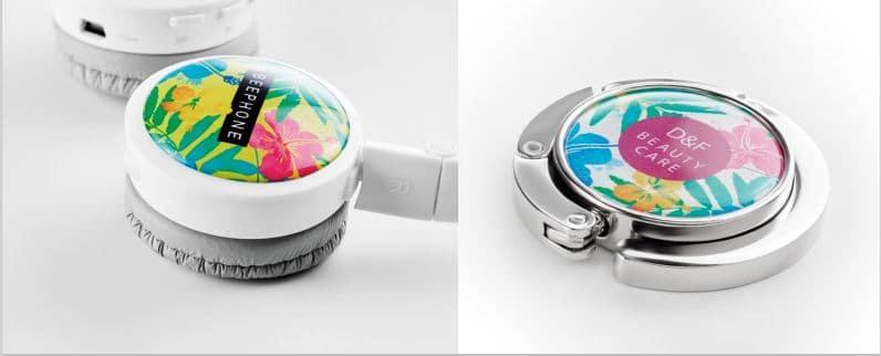 L’impression doming consiste à imprimer un autocollant en quadrichromie numérique et à le recouvrir d’une résine époxy transparente qui lui donne du volume en 3D et un aspect loupe très original. L’autocollant en relief ainsi obtenu peut ensuite se coller sur tout type de support. Le doming peut être réalisé dans plusieurs formes (rond, carré, ovale…). Il résiste très bien aux chocs, à l’usure et aux intempéries (pluie, neige, vent, UV), ce qui lui permet d’être posé en extérieur.